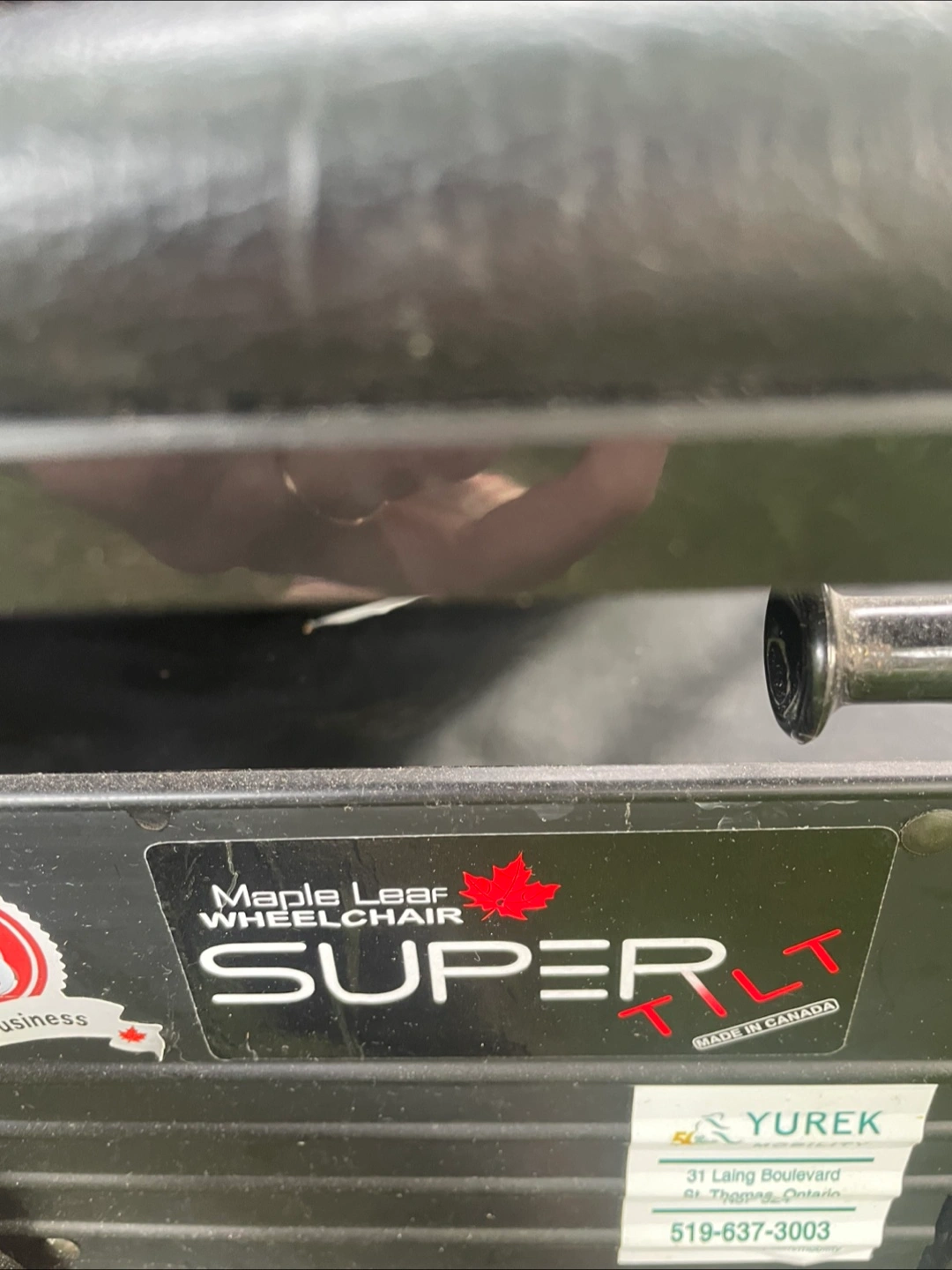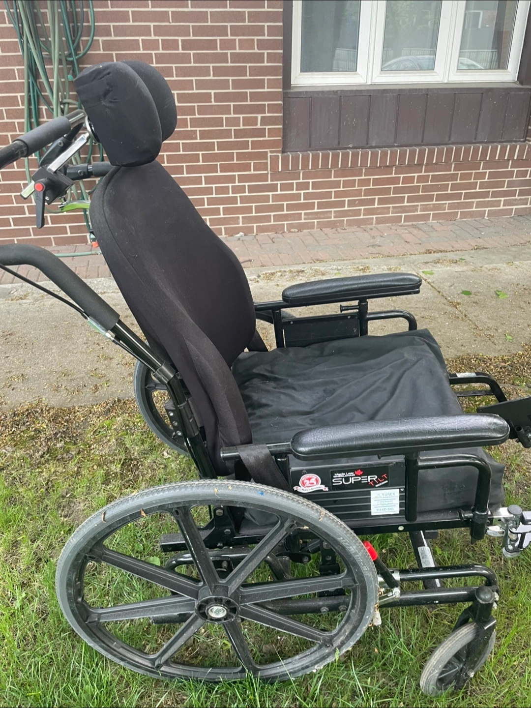 Heavy-duty wheelchair. Black frame and seat. Includes headrest. Made in Canada. Chair is in good condition and clean.