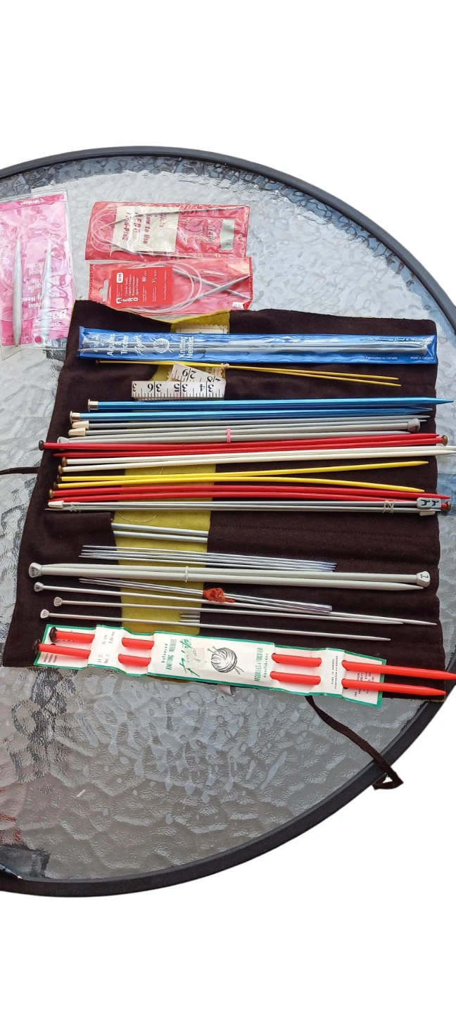 Large collection of knitting needles, includes various sizes and types. Some in original packaging. Aero needles included. Great for knitters of all levels.