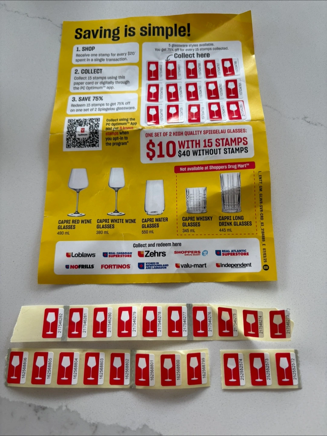 Redeem for glasses at a Loblaws store (see brochure). This is enough for 4 glasses and there will be a few stamps left over to collect more if you want.