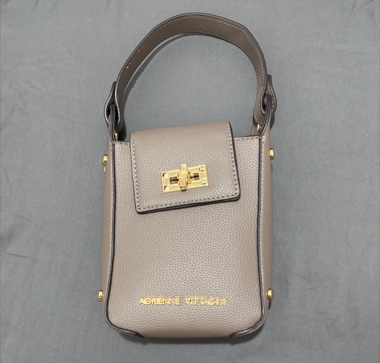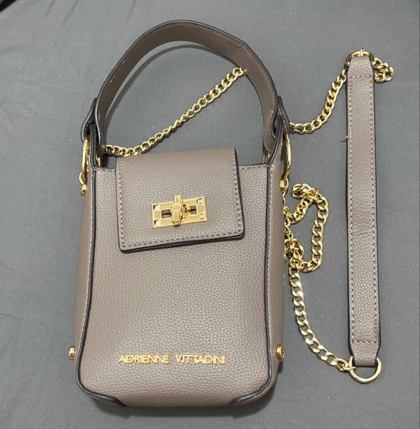 Adorable mini handbag. Grey pebbled leather. Gold-toned hardware. Top handle and detachable chain strap. Perfect for evenings out.