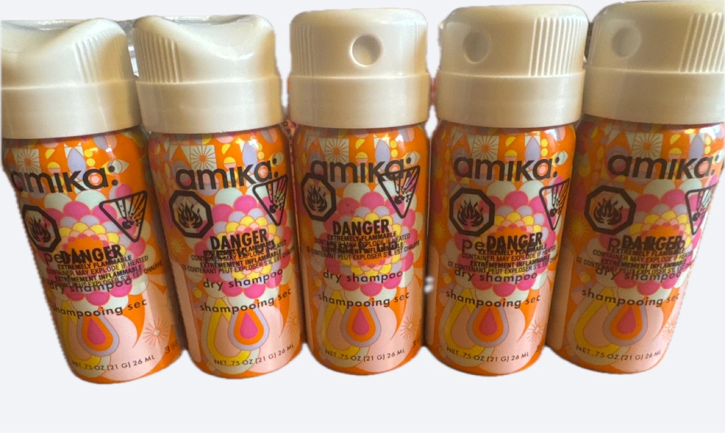 Five mini cans of Amika dry shampoo. Travel size, perfect for a weekend bag.