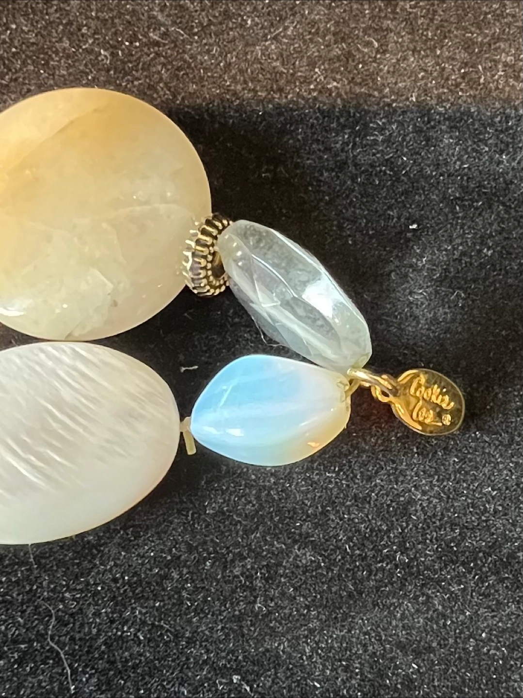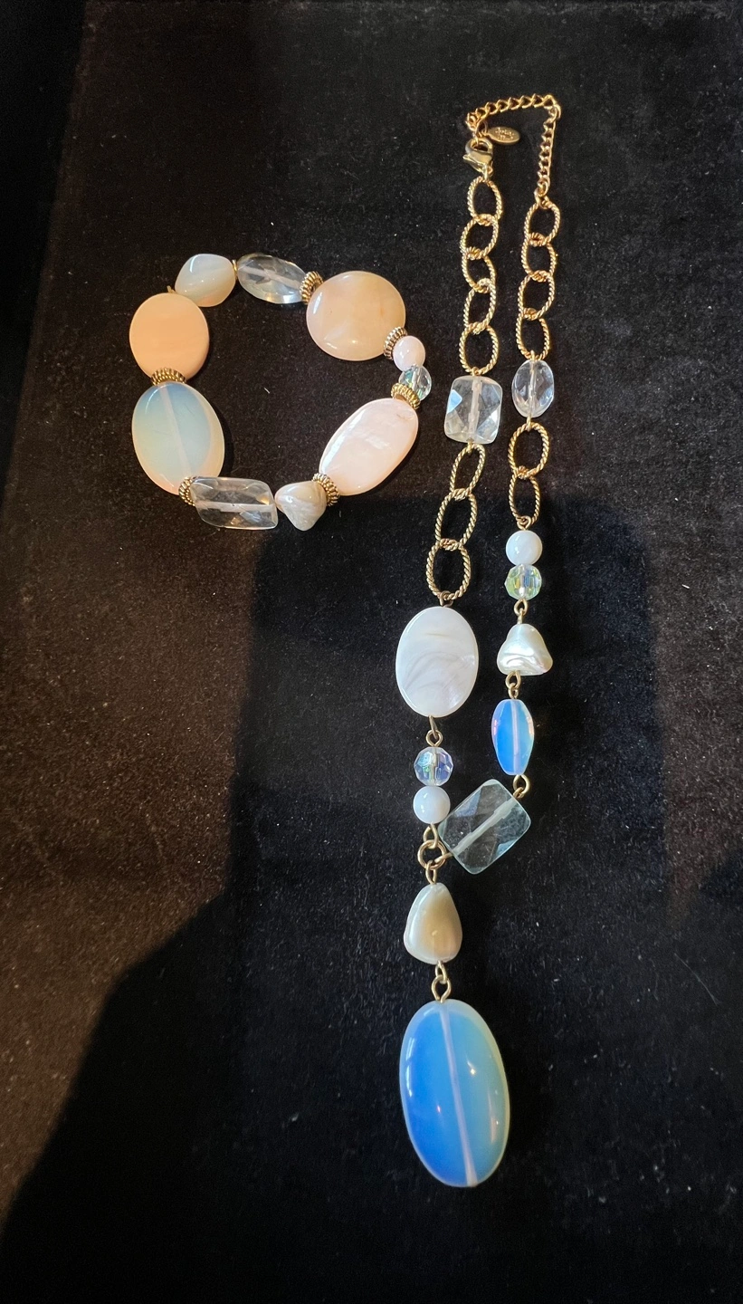 The necklace is a Gold tone chains with soft beach colors of blue and white beads of shell, faux pearls, moonstone / opal like glass beads and large oval shell pieces. The necklace is adjustable from 30" to 34". Both the necklace and bracelet are stunning and could be worn together or separate.