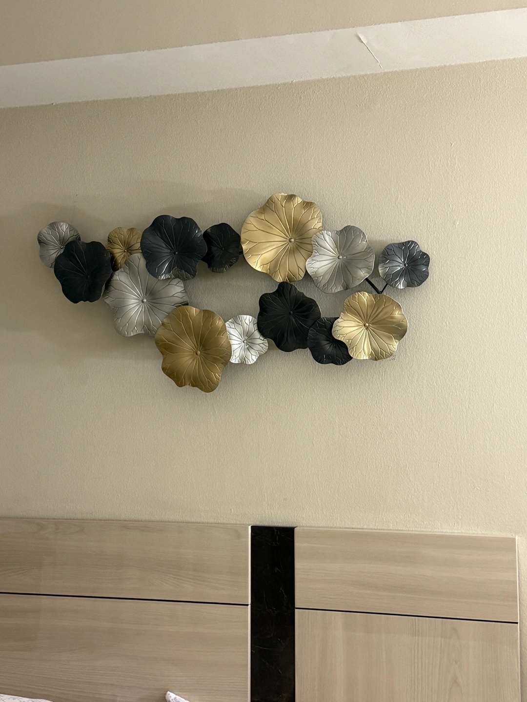 5Elegant wall art featuring multiple lotus flower shapes. Gold, silver, and black colour scheme. Adds a touch of modern sophistication to any room.