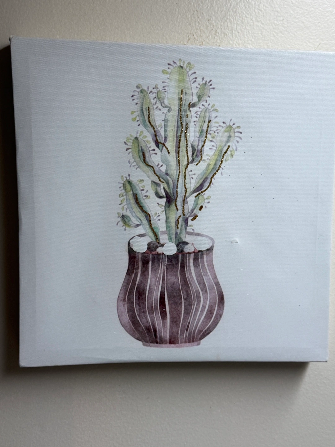 5Two square canvas prints. One features a green cactus, the other a pink flowering cactus. Both in pots. Unique watercolour style. Great for home décor.