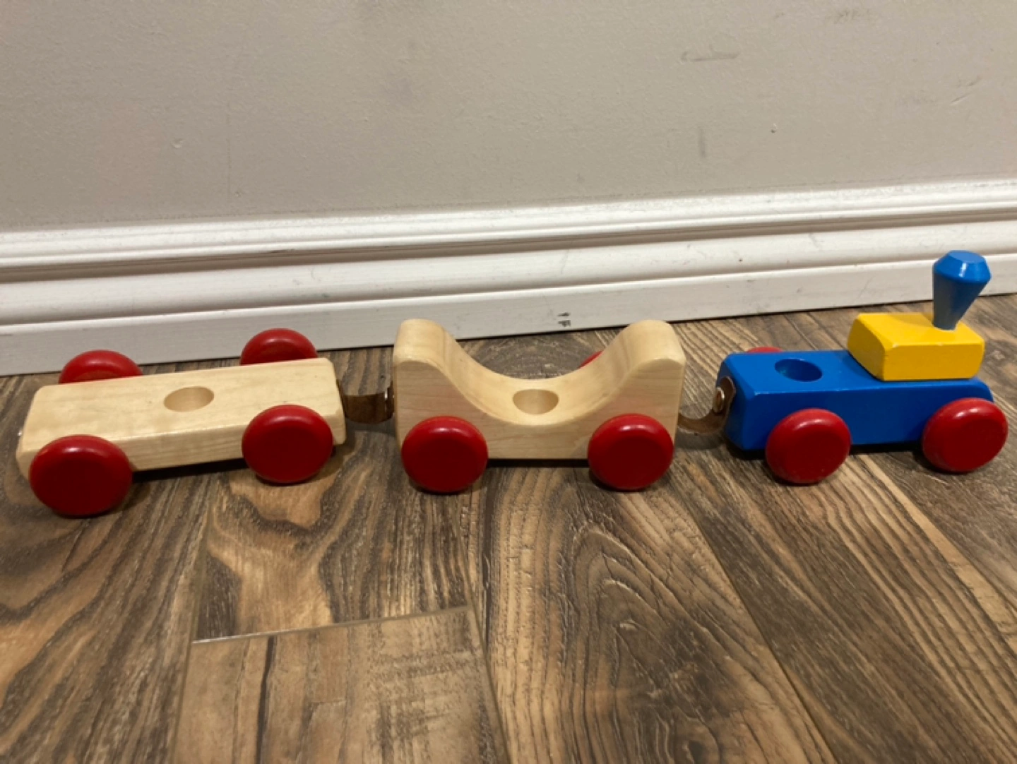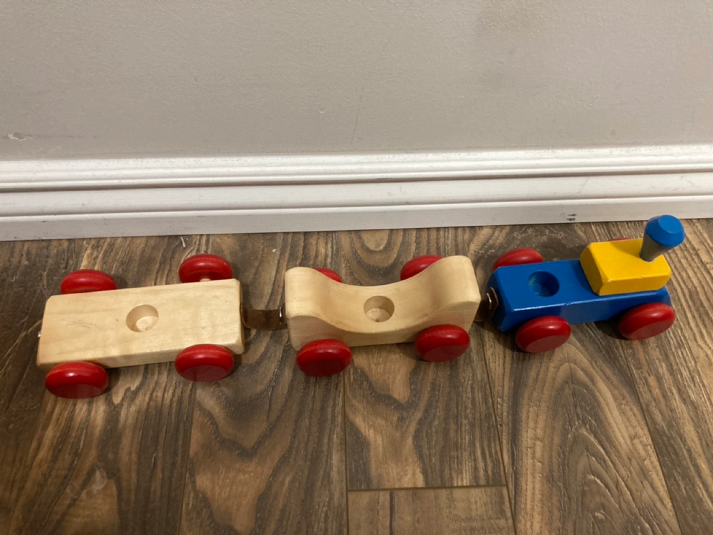 Train set in great condition. Made of solid wood and leather clasps.