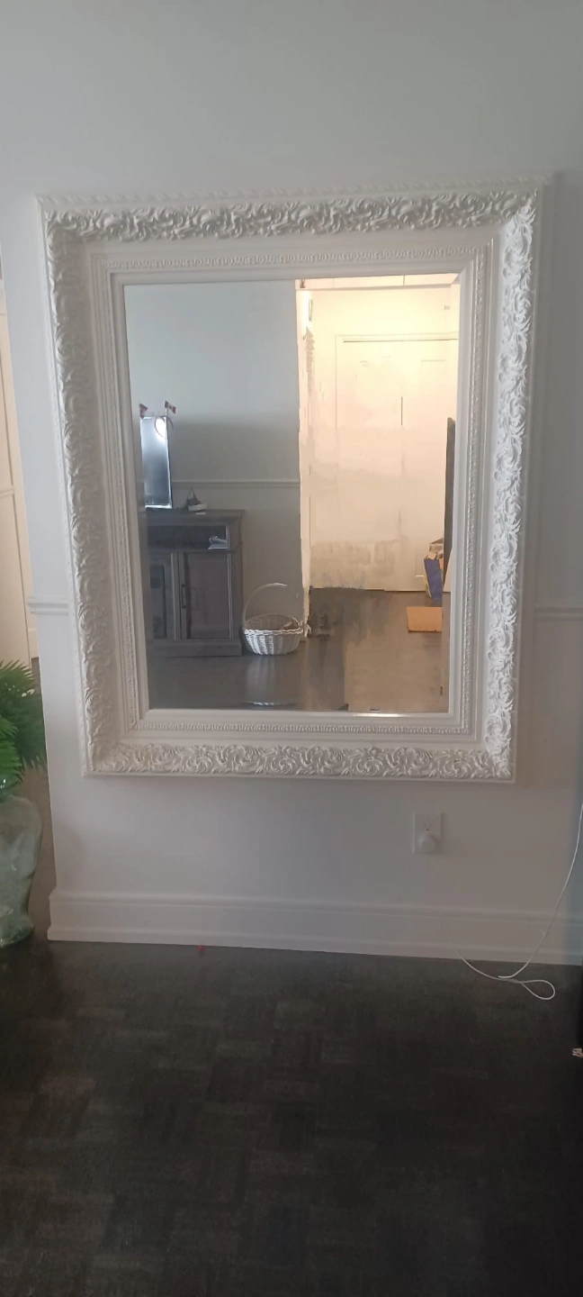 Beautiful large mirror. Intricate white frame. Adds elegance to any room. Perfect for hallways or entryways. Pre-owned but in good condition.