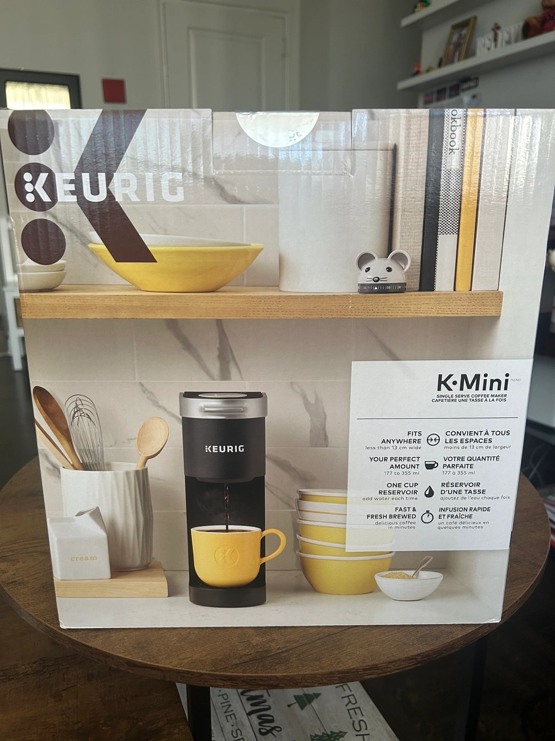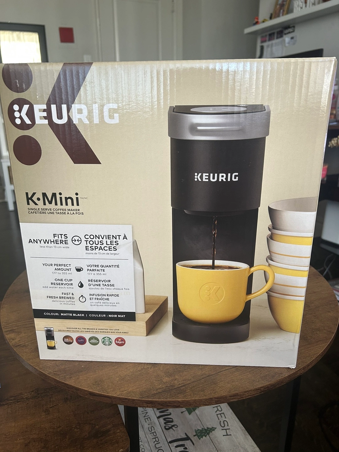 New Keurig K-Mini single serve coffee maker. Compact design, fits anywhere. Makes one cup at a time. Matte black colour. Sealed. Never used. 2 boxes left
