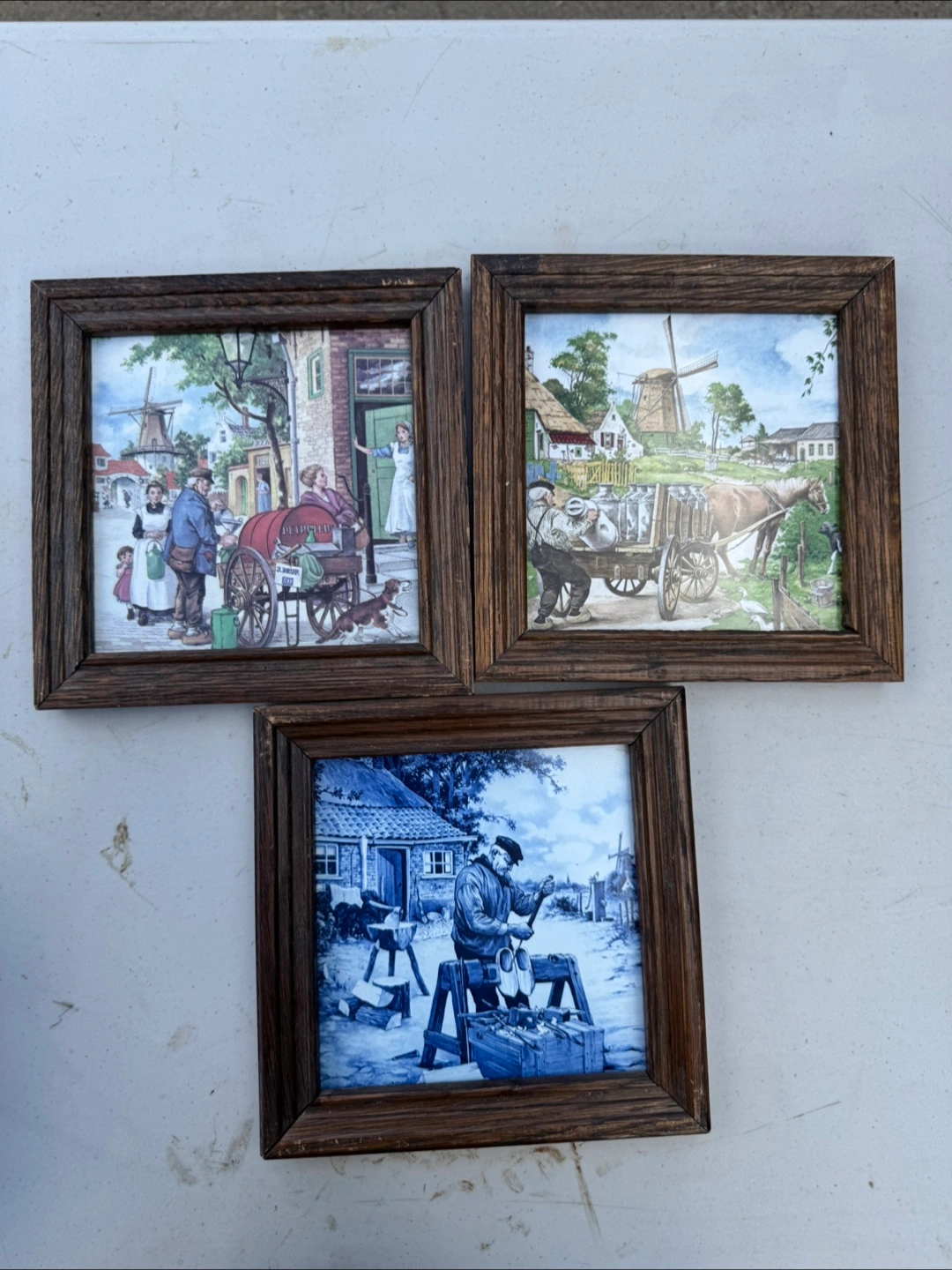 Three framed tiles. Picturesque Dutch scenes. Dark wood frames. Unique collectables.