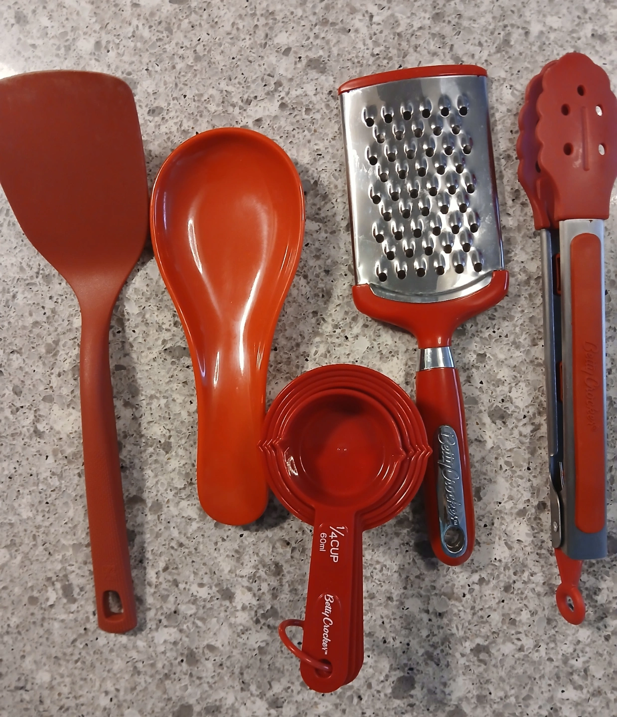 Set of red kitchen gadgets. Includes spatula, spoon rest, grater, measuring cups, and tongs. Great for cooking and baking. From a smoke free,pet free home.