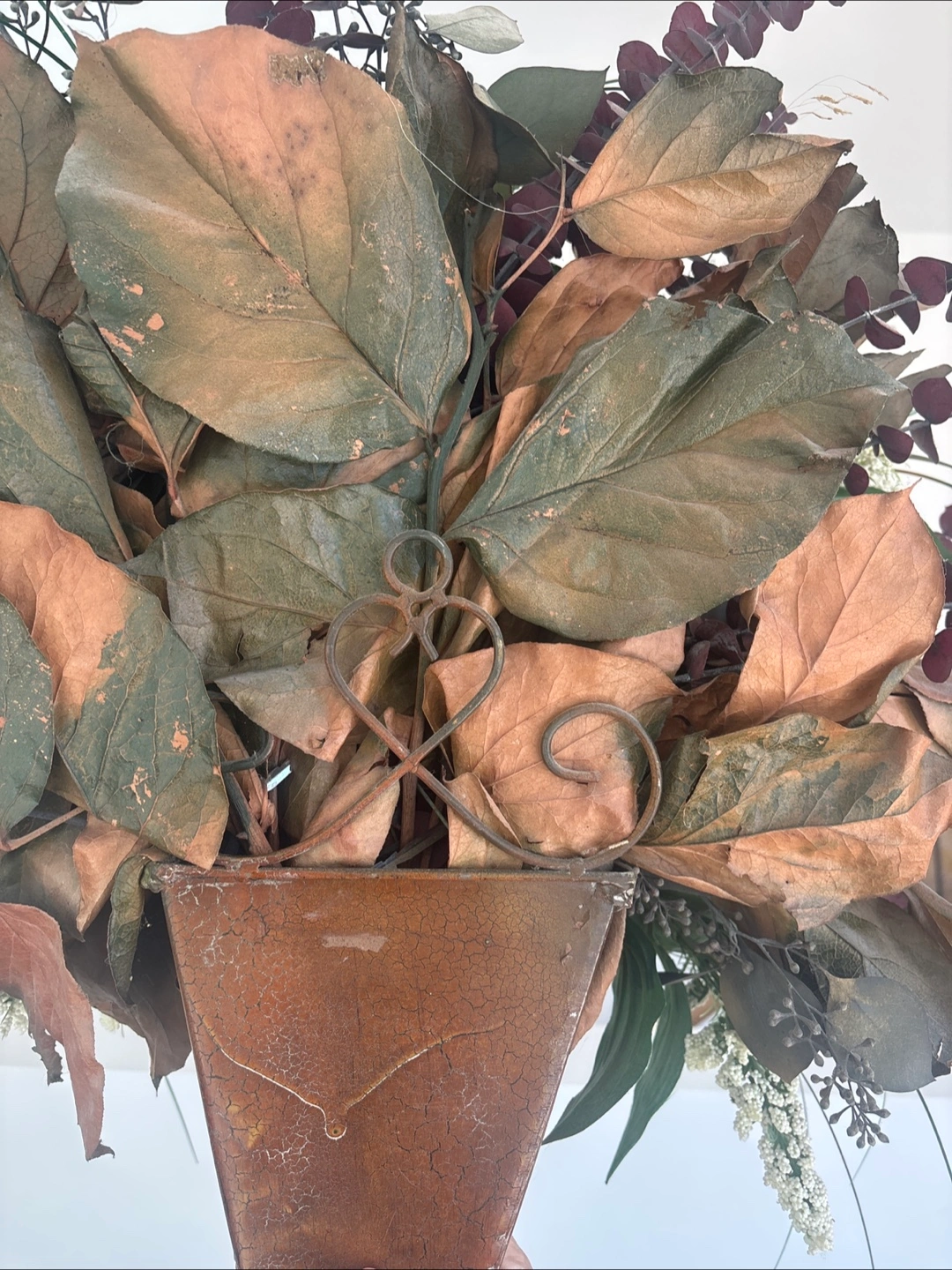 Beautiful artificial floral arrangement. Features roses, eucalyptus, berries, and other fall foliage. Comes in a decorative brown vase. Perfect for fall home decor. Wall hanging.