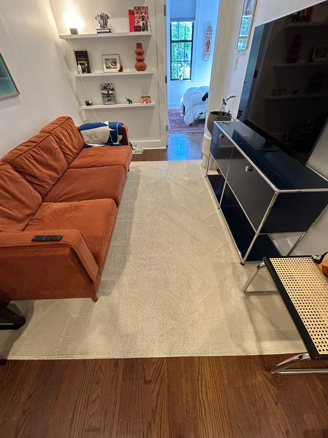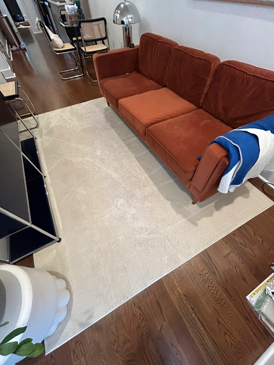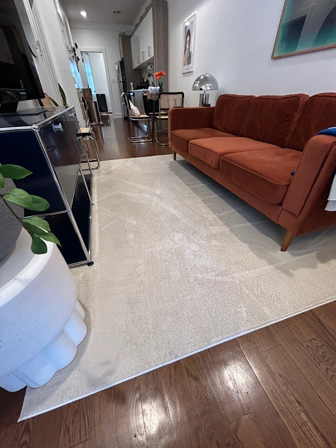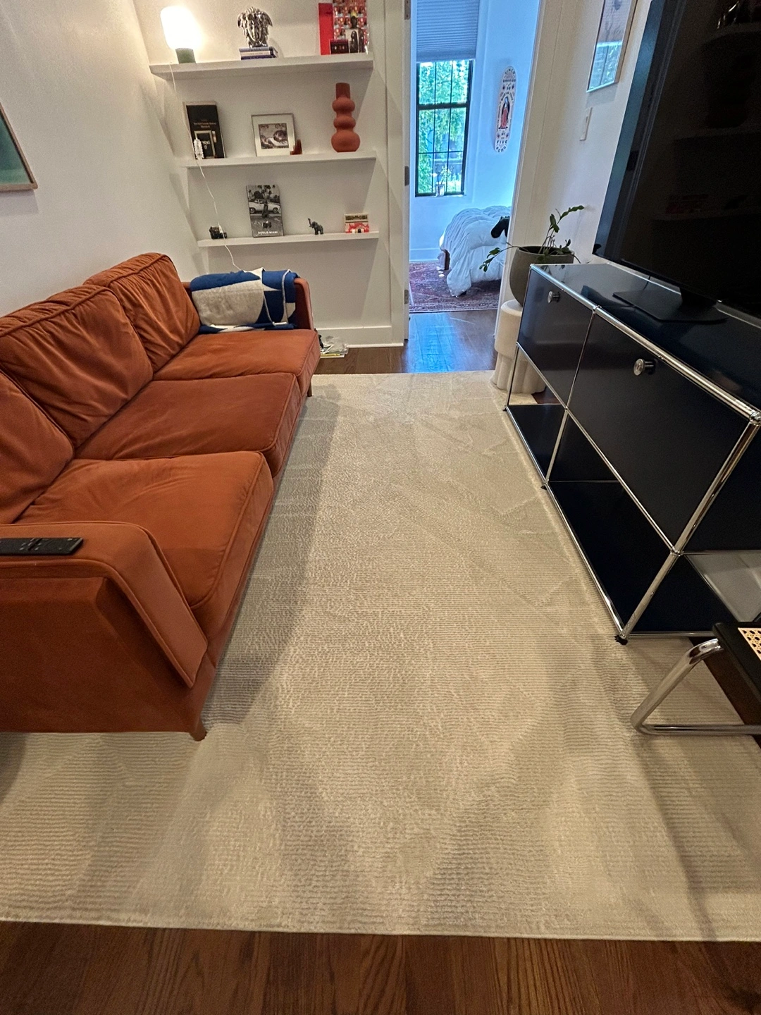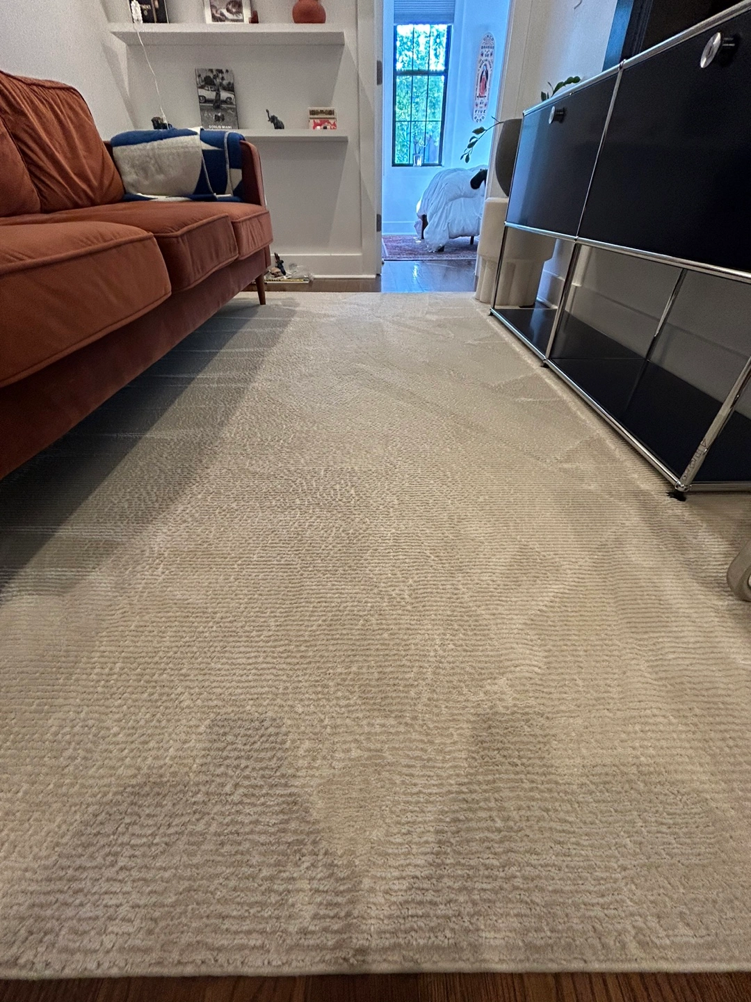 Neutral color, subtle striped texture. Good for living room or bedroom. Soft and comfortable underfoot.