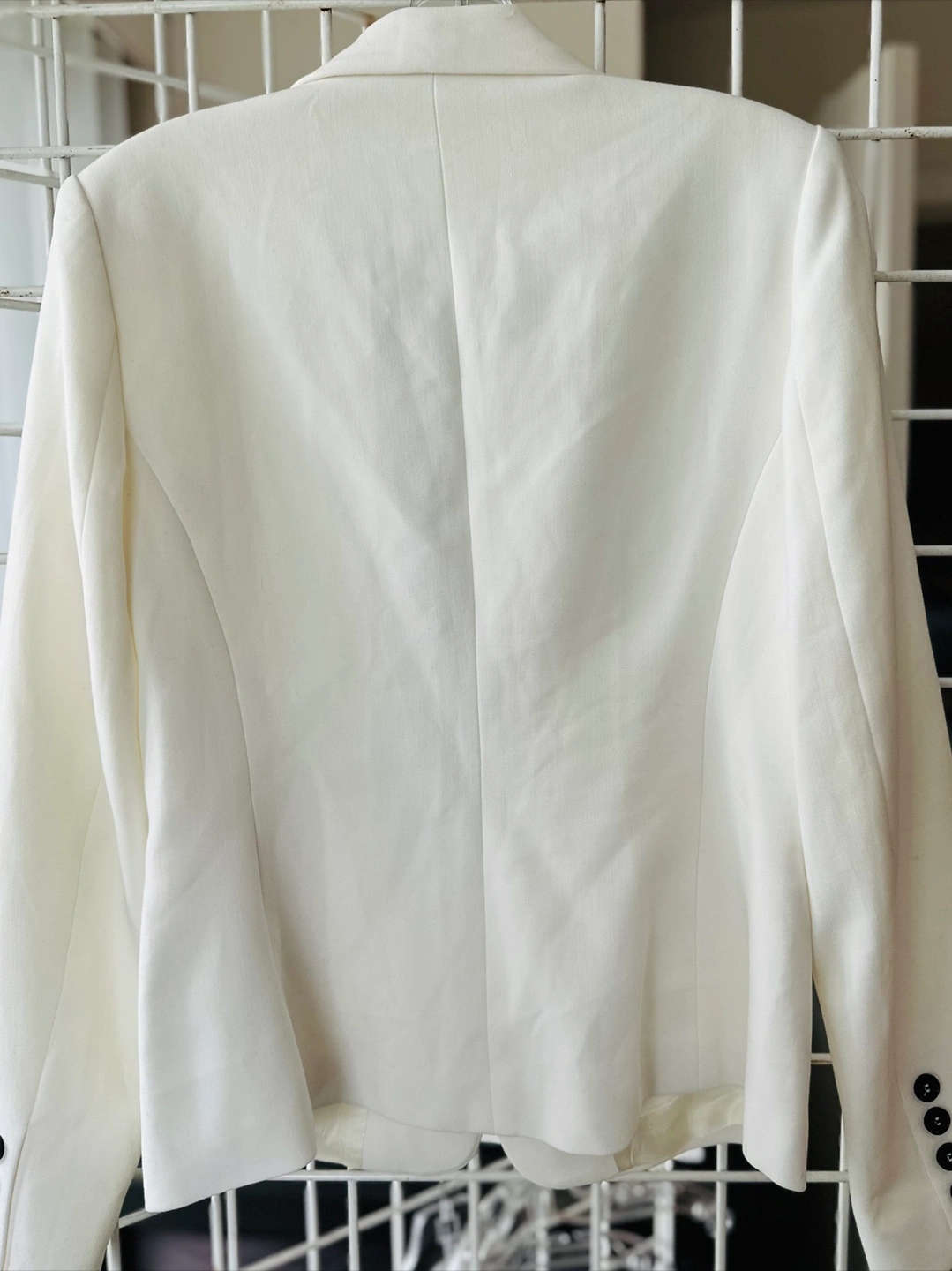 Elegant white blazer featuring a black velvet-like lapel. Single button closure. Size Medium. Excellent condition.
