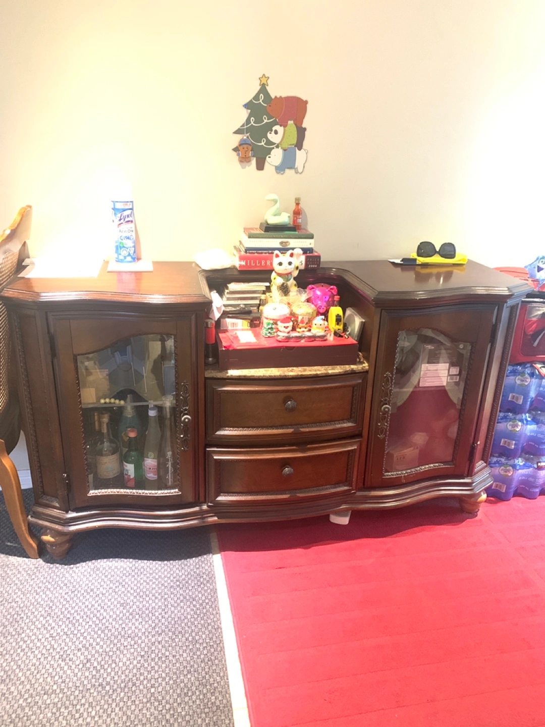 Elegant dark brown wooden buffet cabinet. Features glass doors and ample storage space. Perfect for dining room or living room.
