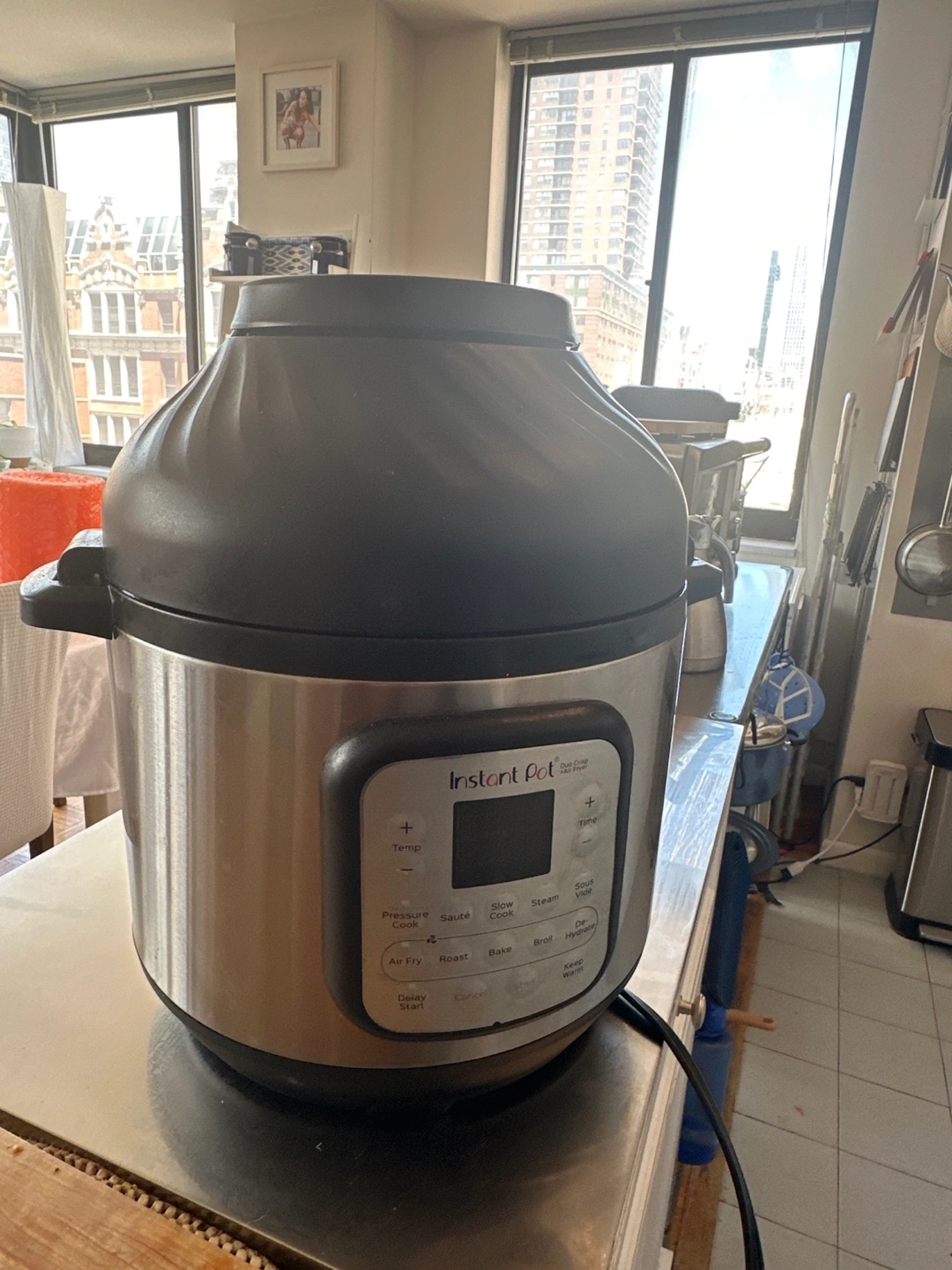 Multi-use kitchen appliance. Features pressure cooking, air frying, slow cooking, and more. Stainless steel exterior. Good condition, brand new fryer basket from warranty