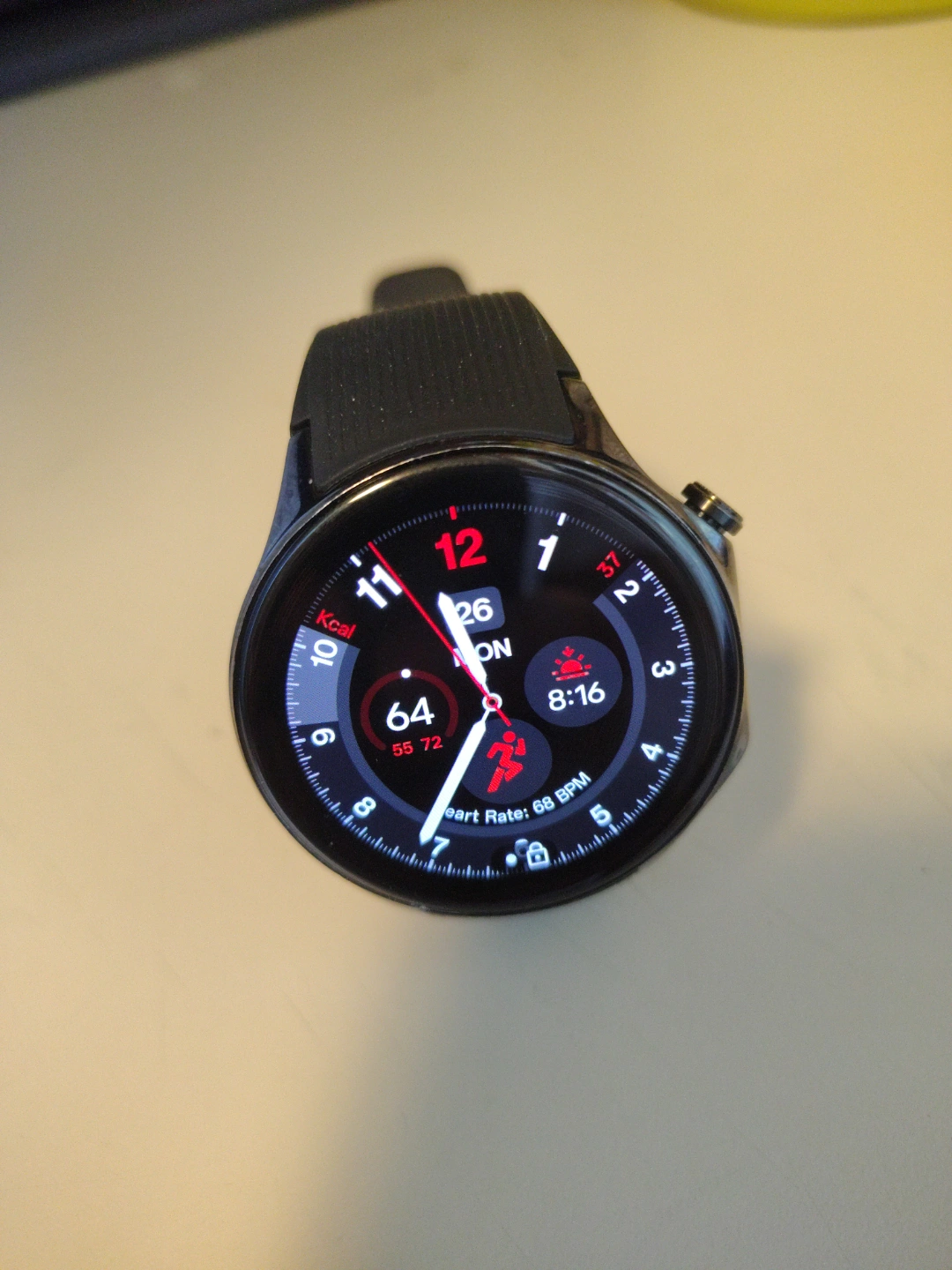 Smartwatch, black band. Round face, dark screen. Shows time, date, steps, heart rate, and calories burned. Good condition.