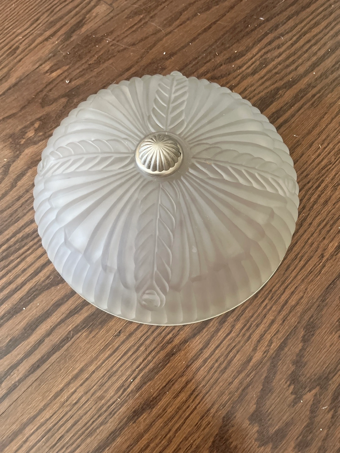Two frosted glass ceiling light covers. One features an etched leaf design. Nice for a vintage or modern look. Sold as is.