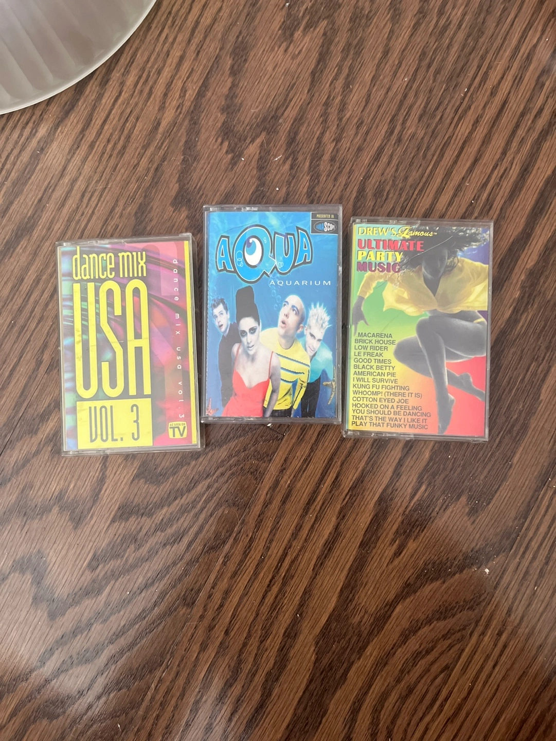 Lot of three cassette tapes. Includes Aqua's Aquarium album, Dance Mix USA Vol. 3, and Drew's Famous Ultimate Party Music. Great for collectors or 90s music lovers. Let me know which ones you’re interested in and if you purchase all of them, I’ll even give you this beige plastic box for free.