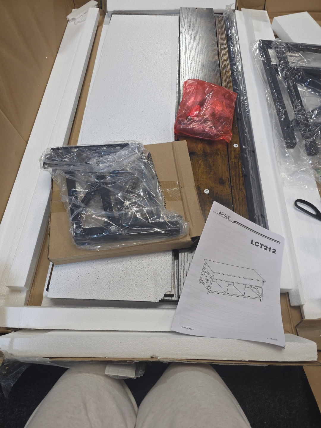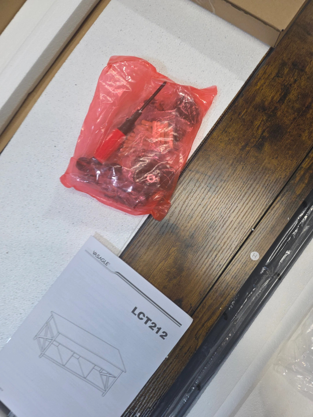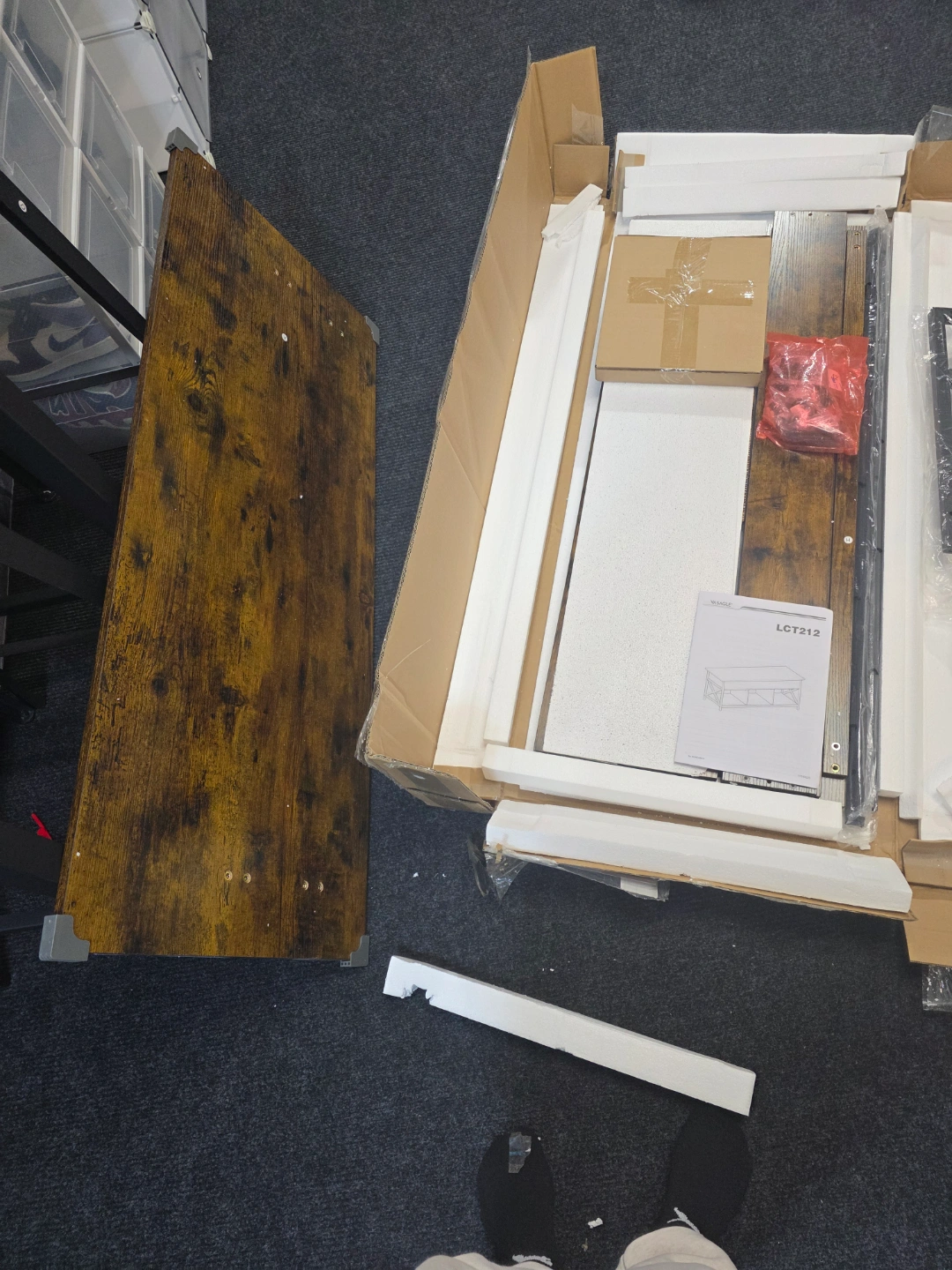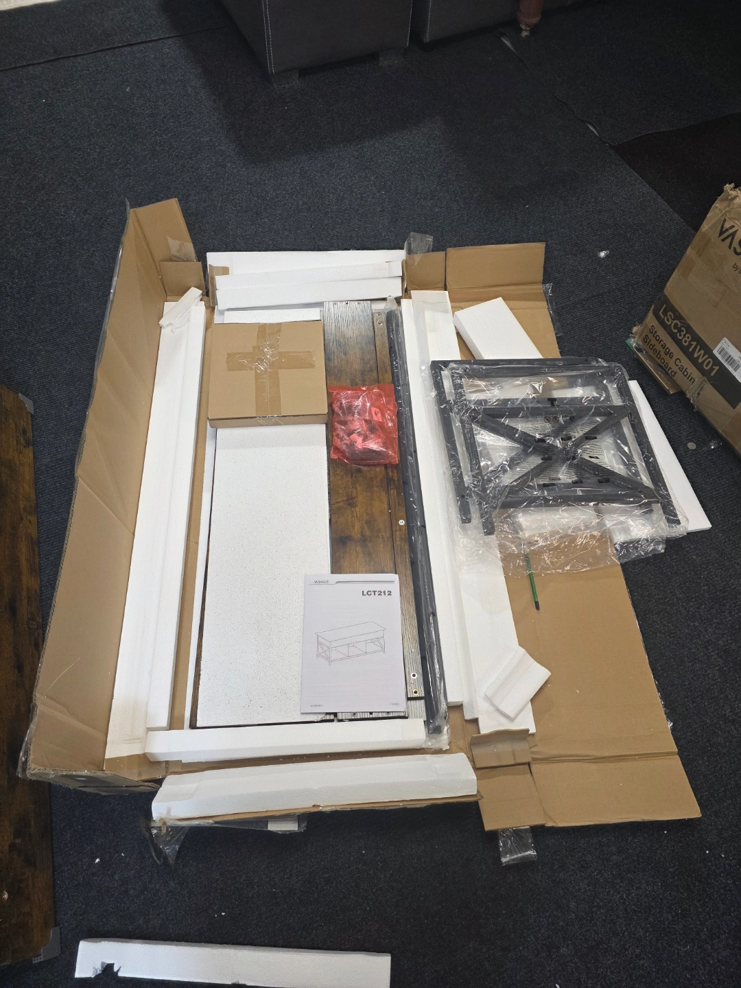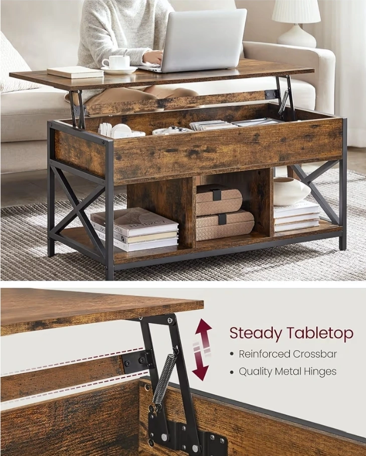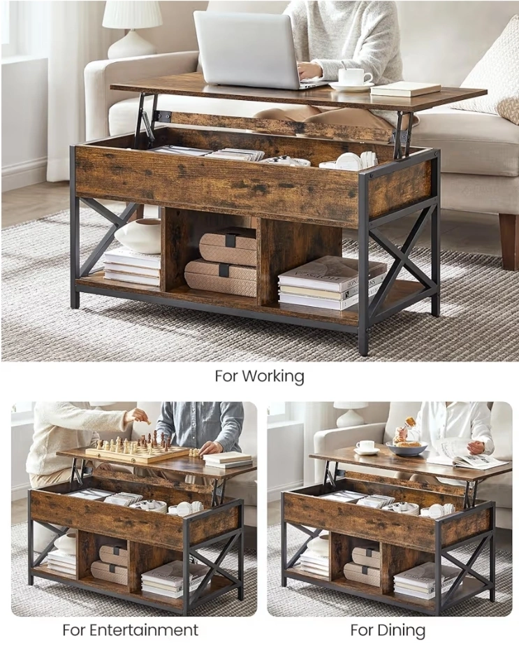 Rustic brown lift-top coffee table. Features storage compartments and metal frame. Great for working, dining, or entertaining. Holds up to 300 lbs.