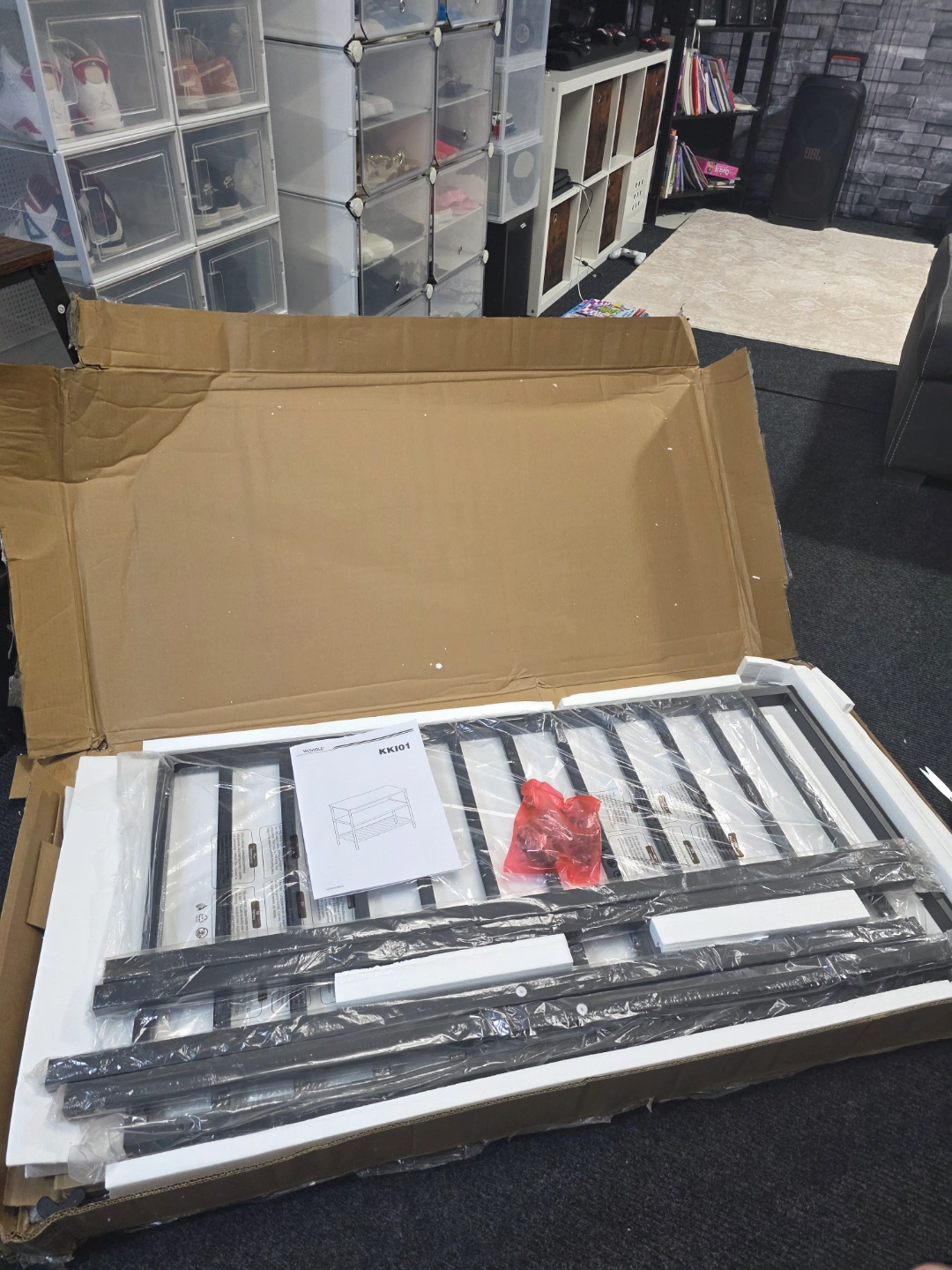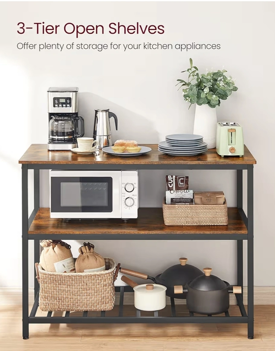 Rustic brown and black kitchen island. Three-tier shelving for ample storage. Metal frame. Durable and stylish. Great for small kitchens.