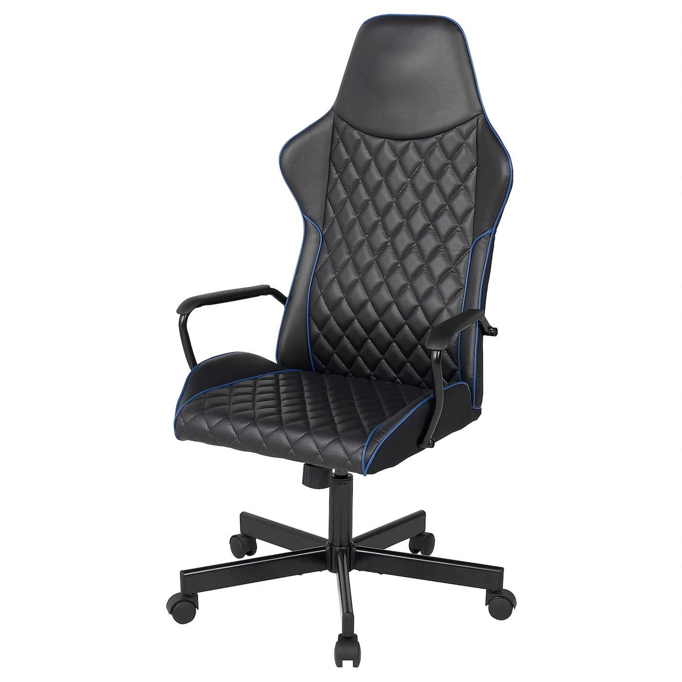 Comfortable gaming chair. Black leatherette with blue accents. Adjustable height. Five-star base with smooth-rolling casters. Excellent for gaming or office use.