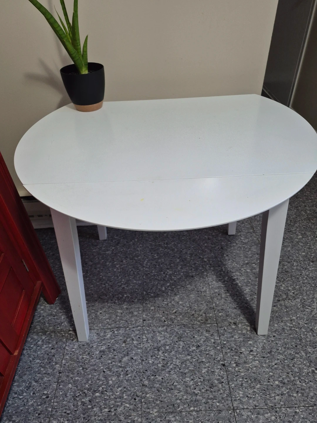 Selling a white, round dining table that can be extended! It's perfect for smaller spaces but can easily accommodate more guests when needed. There are some signs of use with minor marks on the surface, but overall it's in good condition and ready for a new home
