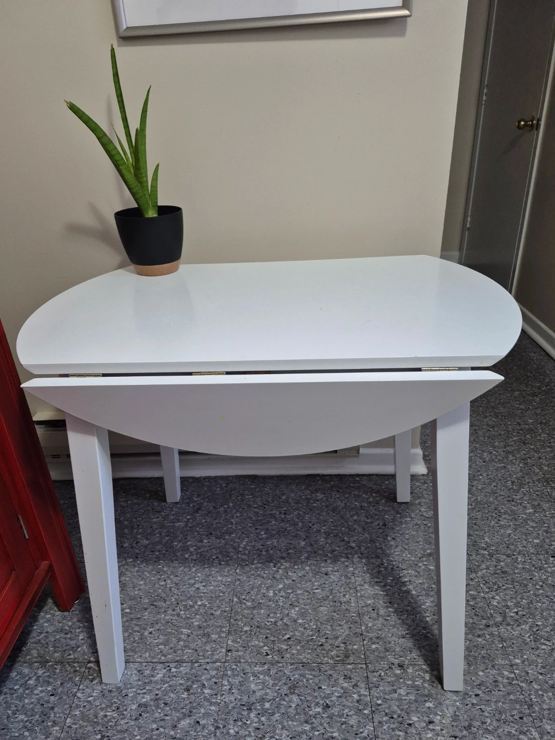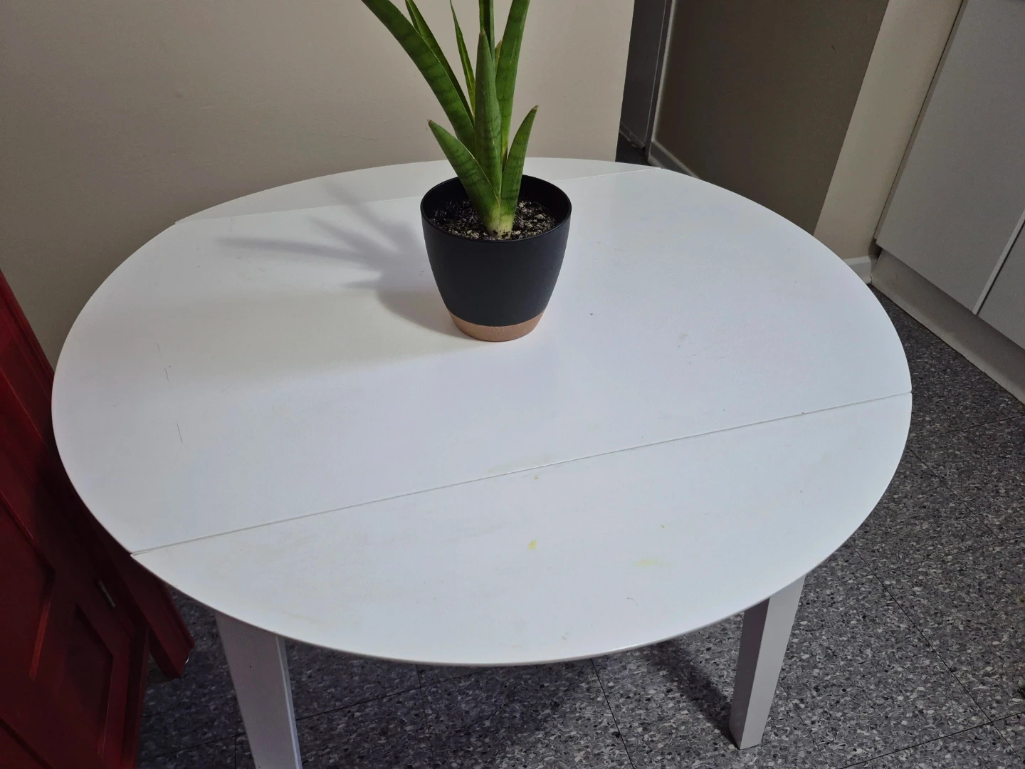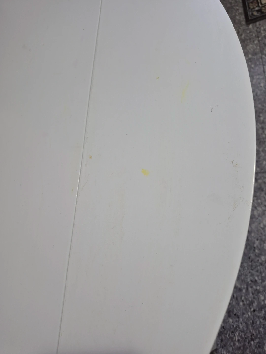 Selling a white, round dining table that can be extended! It's perfect for smaller spaces but can easily accommodate more guests when needed. There are some signs of use with minor marks on the surface, but overall it's in good condition and ready for a new home