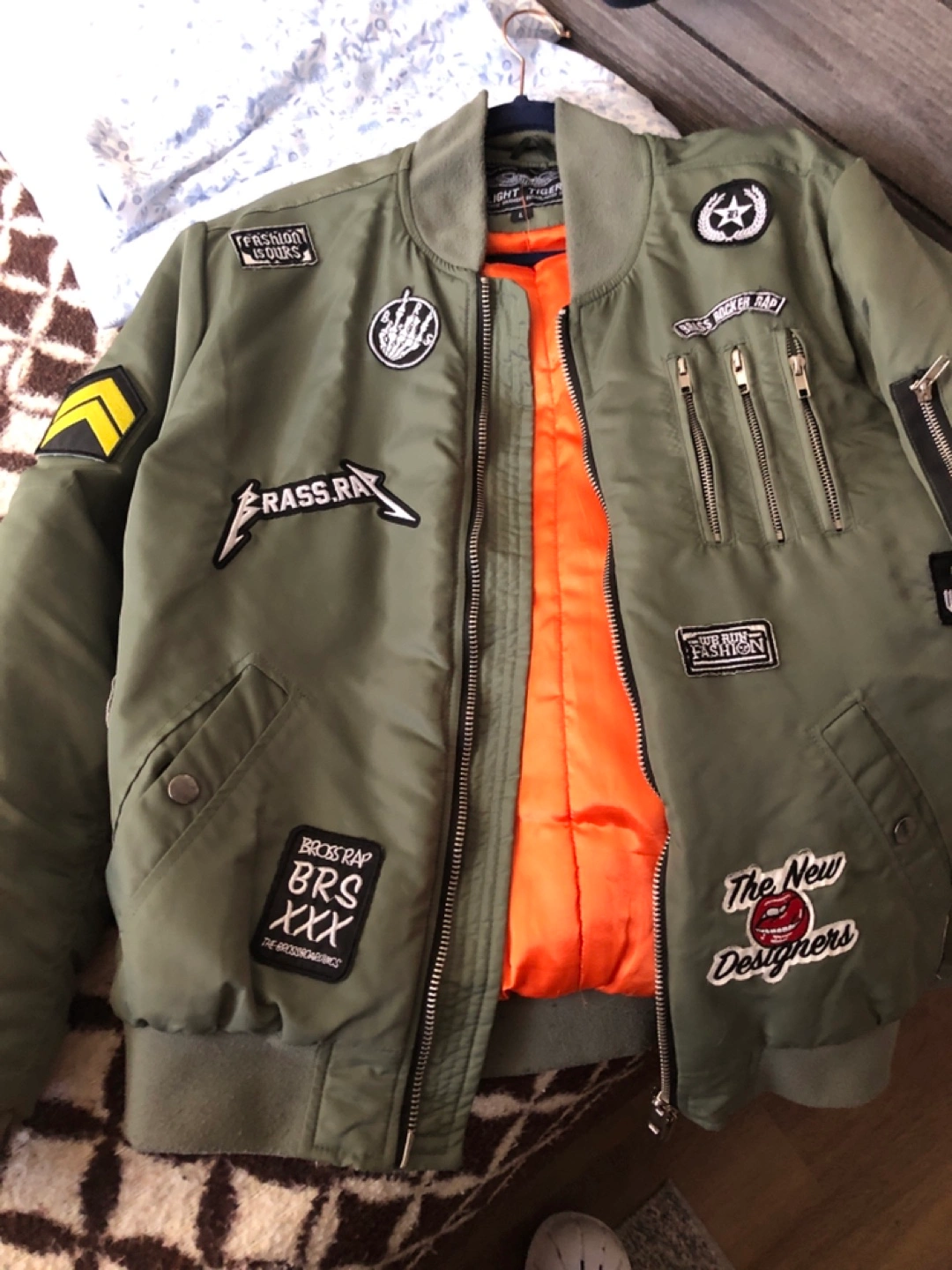 Olive green bomber jacket. Features multiple patches. Orange lining. Zipper closure. Multiple pockets.