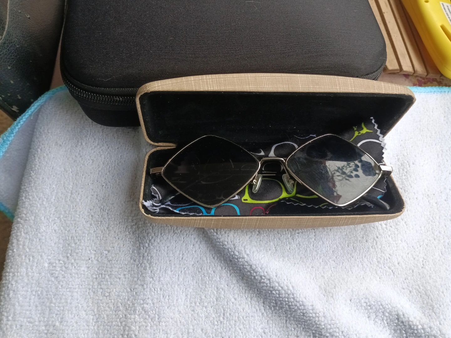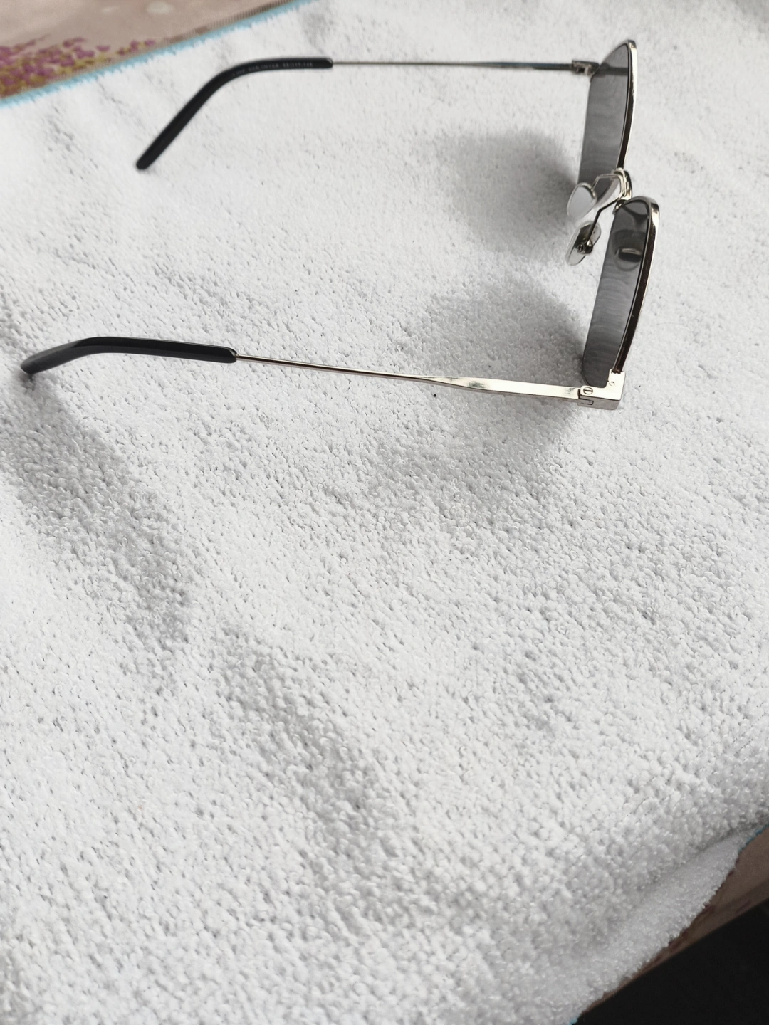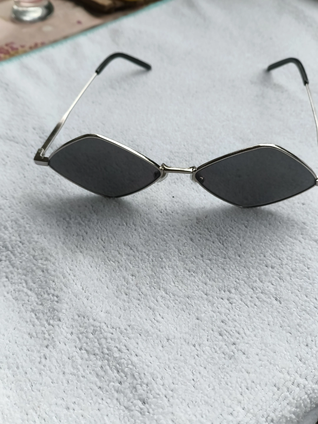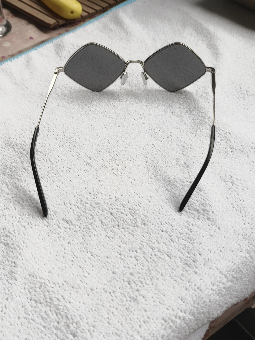 Unique diamond-shaped sunglasses. Silver metal frame, black lenses. Stylish and modern design. Great for summer. Saint Laurent Paris Designer Sunglasses paid $450.00 sorry to say really minor scratch on both lenses just happened still wonderful glasses.100 or B/O