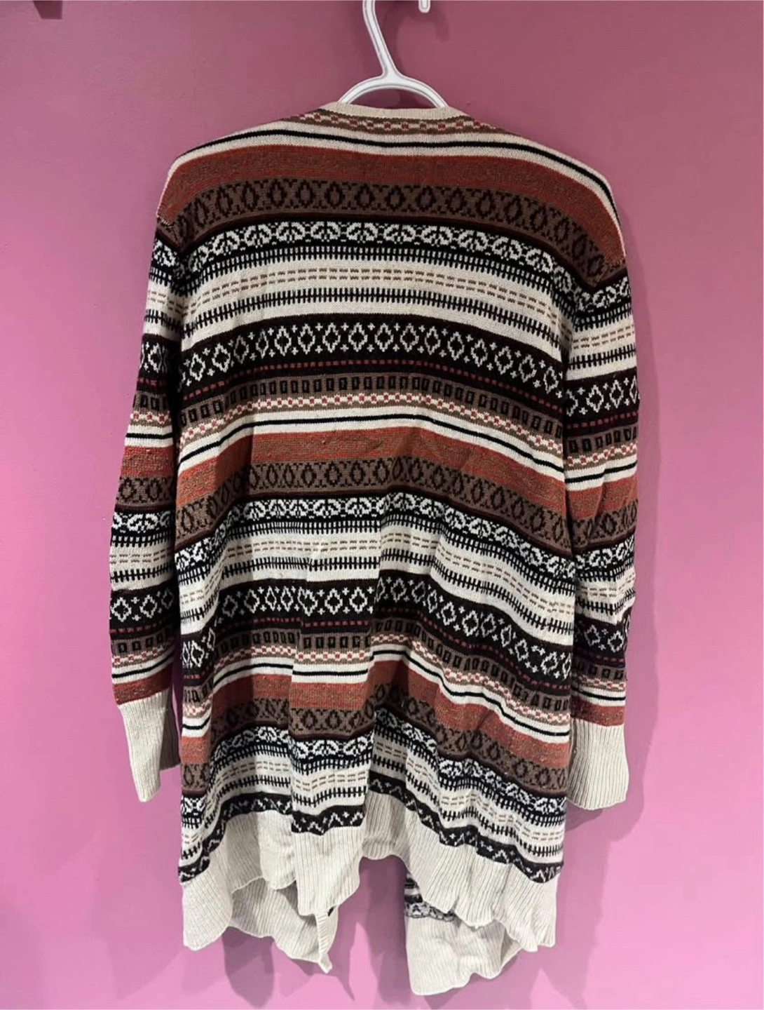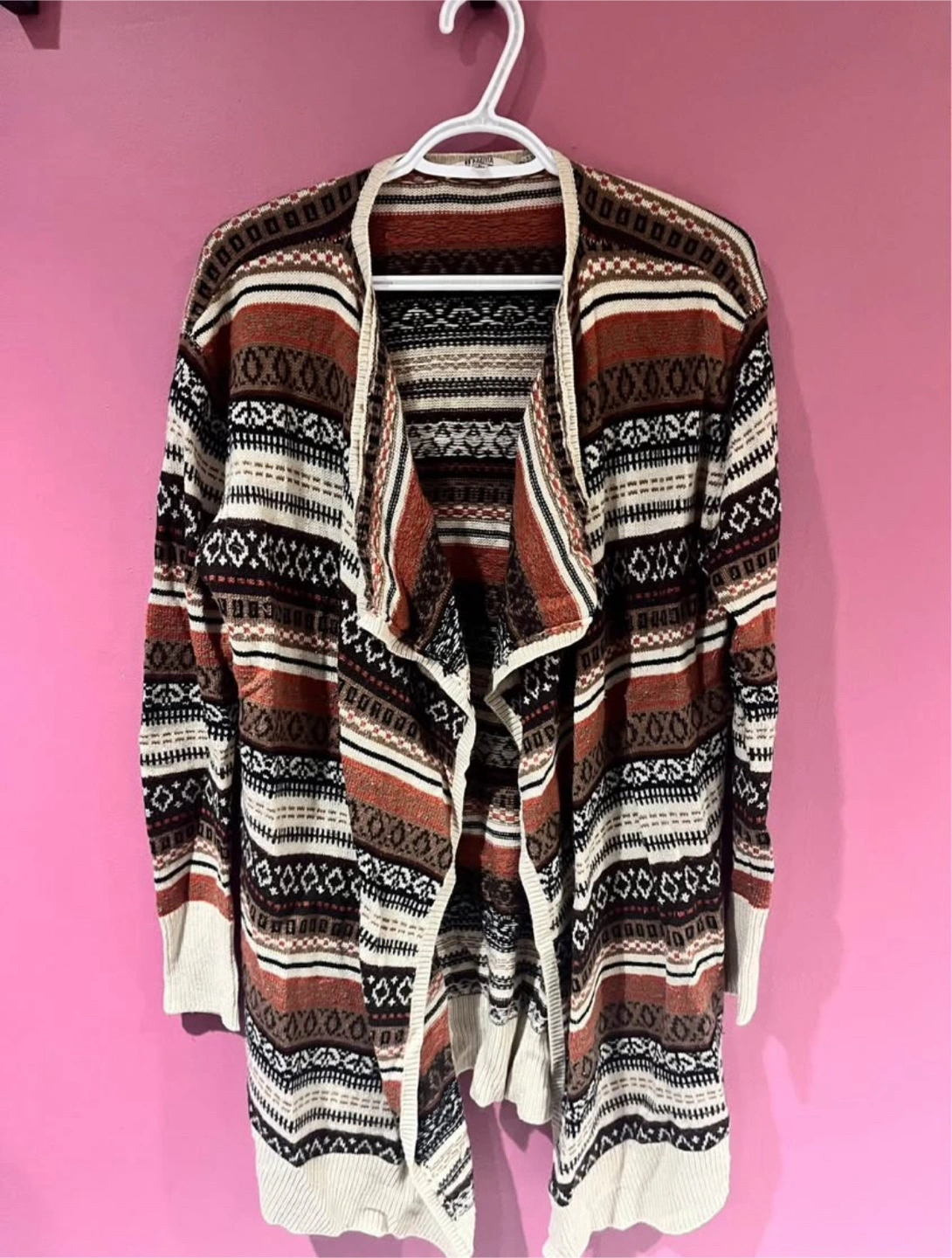 103Women's size large knit cardigan. Features a southwestern-inspired pattern in autumnal colours. Open front, long sleeves. Soft and comfortable material.