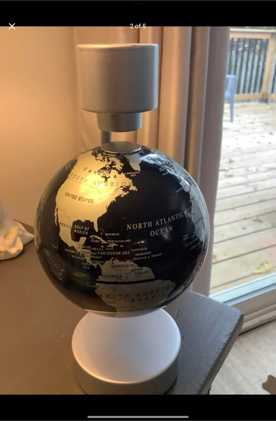 Magnetic levitating, floating globe. About 4 1/2” diameter. 7” tall. Globe will also spin slowly with room movements. Nice tone of deep navy blue water and silver grey earth. Lettering of countries and oceans is very clear and legible. Fun, unique decor piece.