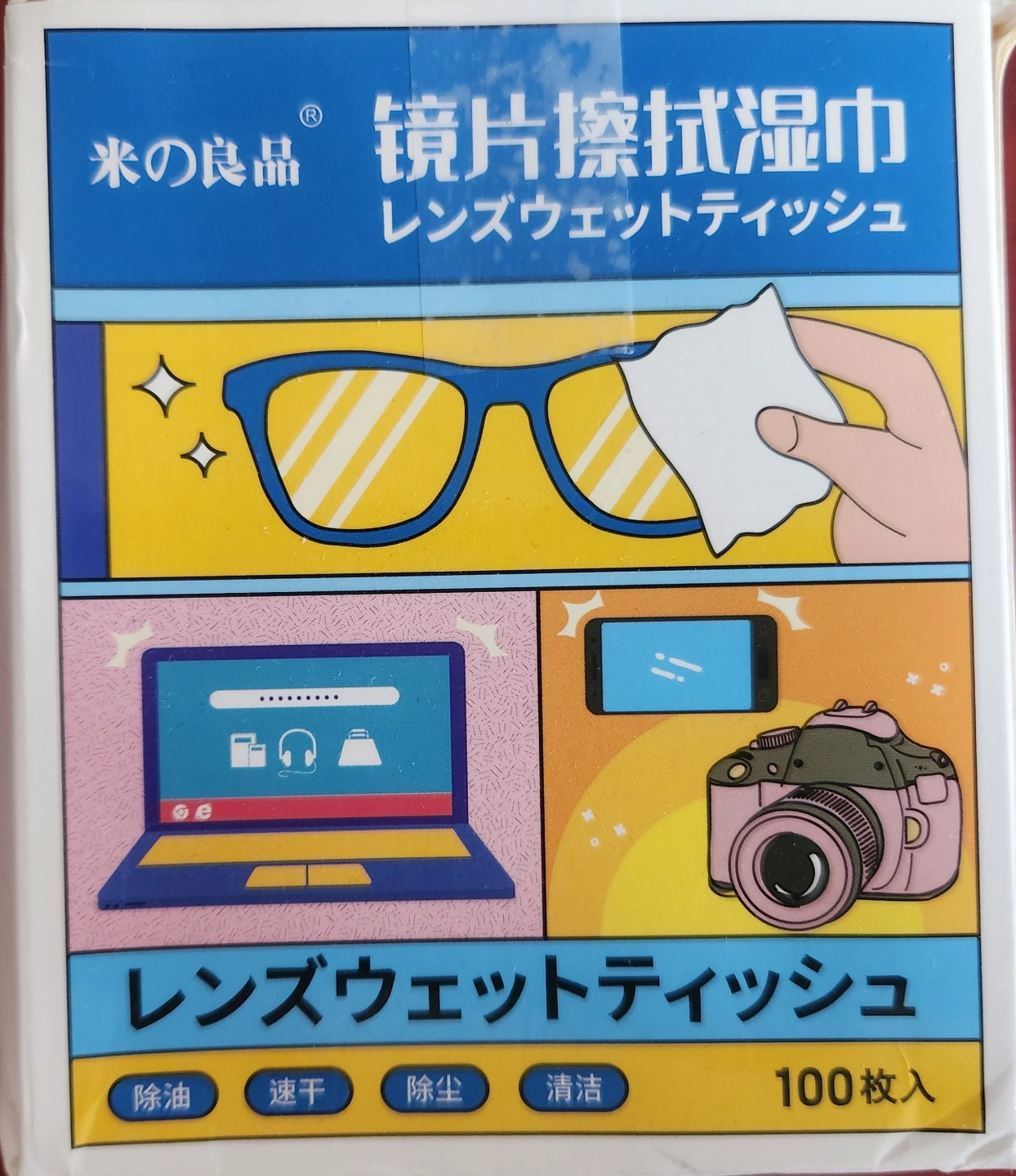 Package of lens cleaning wipes. Suitable for glasses, laptop screens, phones, and cameras. Oil removing, quick drying, dust removing, and cleaning.