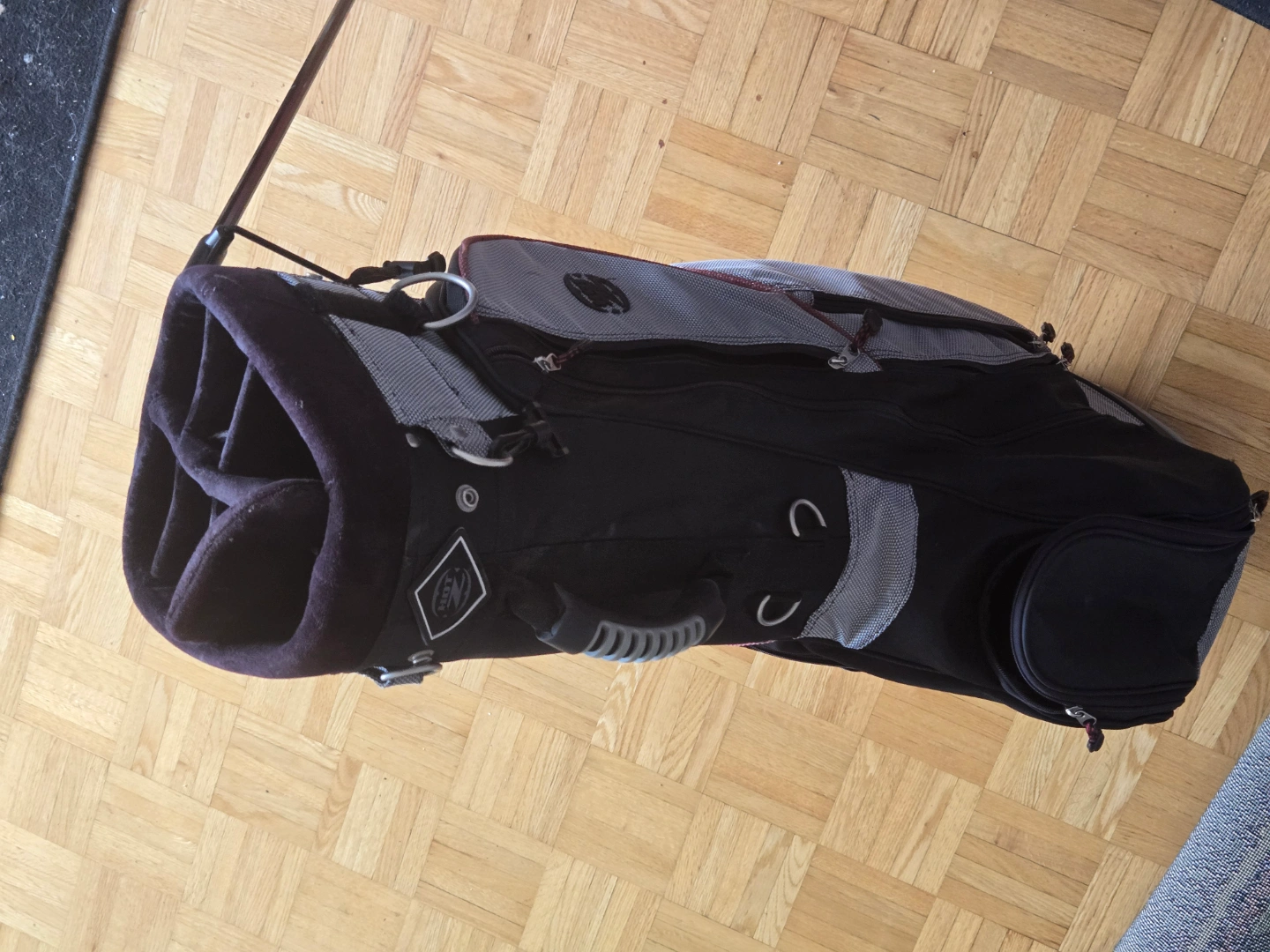 Pre-owned HOT Z golf bag. Black, grey, and red colour scheme. Multiple pockets. Good condition, some minor wear. all zippers work perfectly. no rips in fabric anywhere.