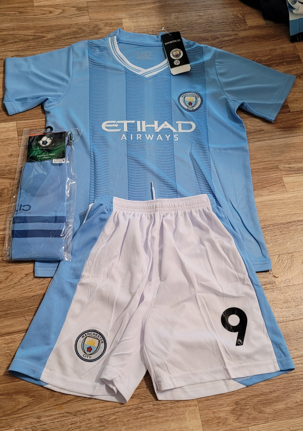 Several kids' soccer jerseys available. Each set includes a jersey, shorts, and socks. Different teams and sizes. New with tags.