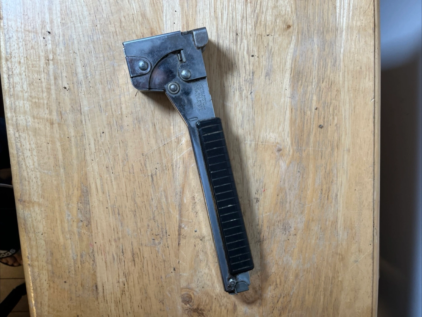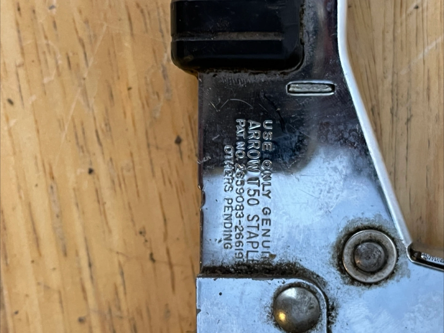Used Arrow T50 staple gun. Metal construction with a plastic grip. Uses Arrow T50 staples.