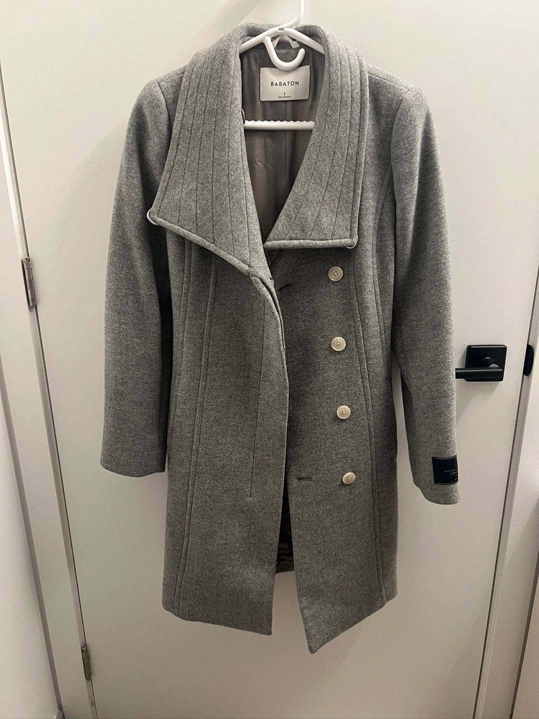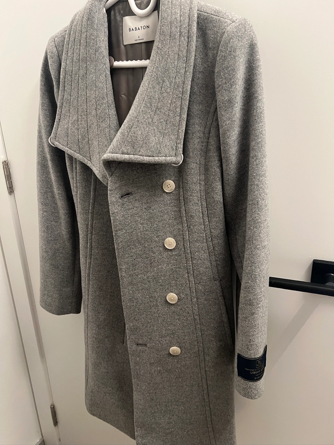 Beautiful grey wool coat. Features a collar, double-breasted button closure, and pockets. Made with virgin wool from Italy's finest mills.