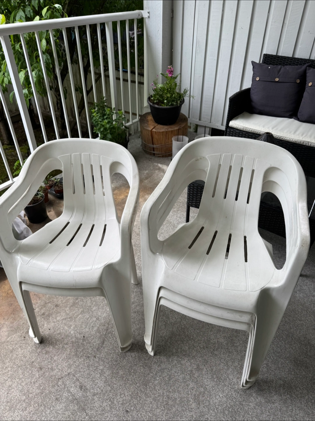 5x - white plastic chairs. Great for camping ,patios or balconies.
