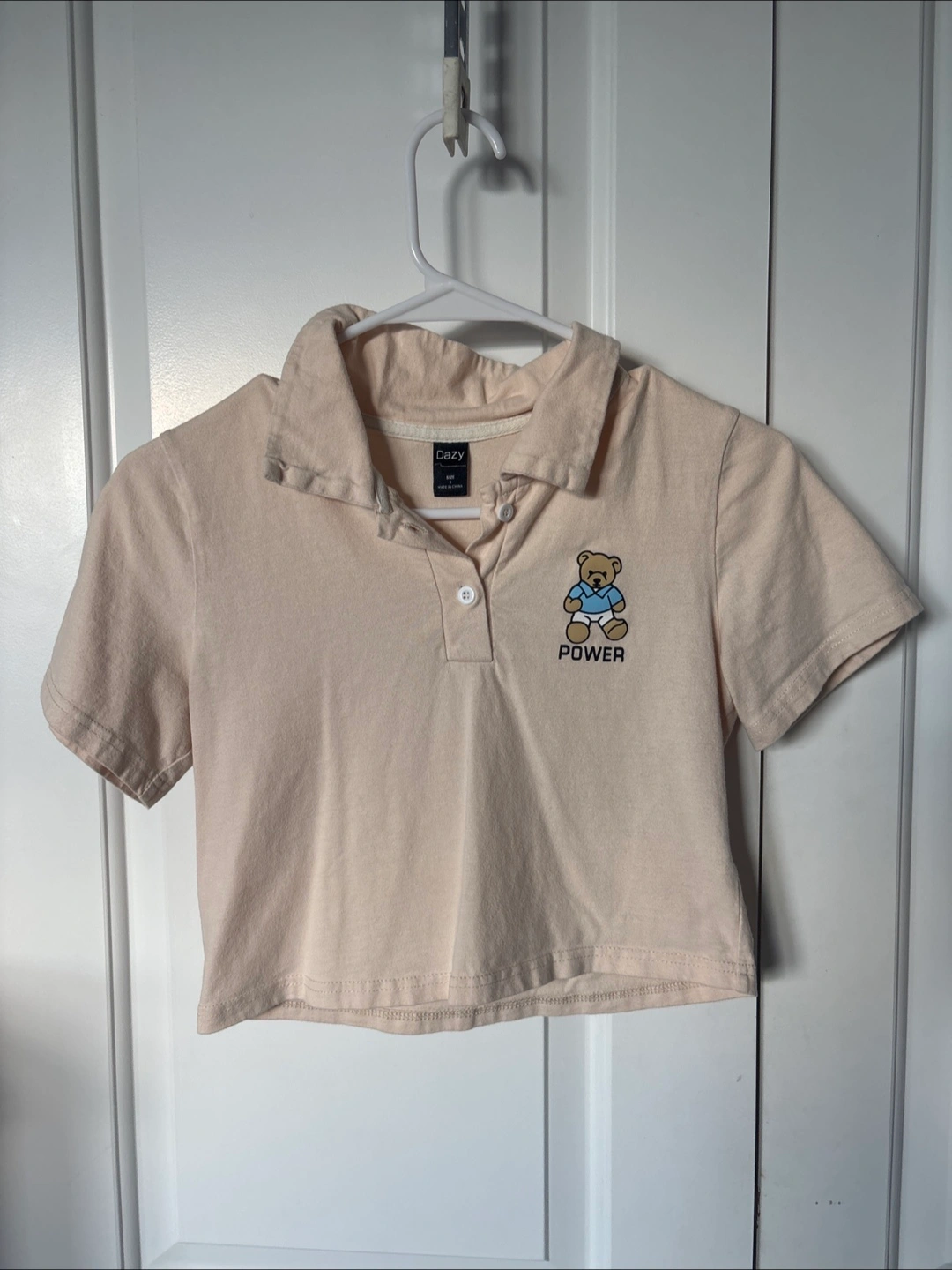 Cream colored cropped polo shirt. Features a small embroidered bear graphic with "POWER" text. Short sleeves and collared neckline. Size small.