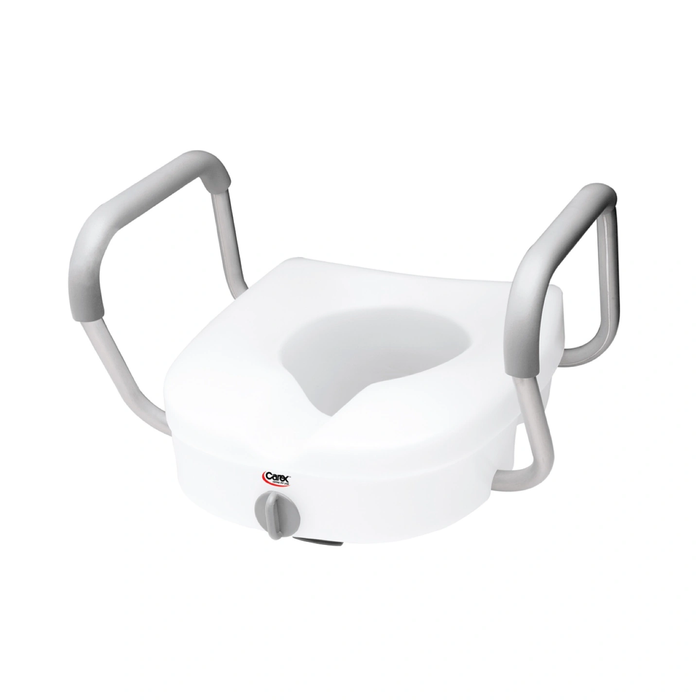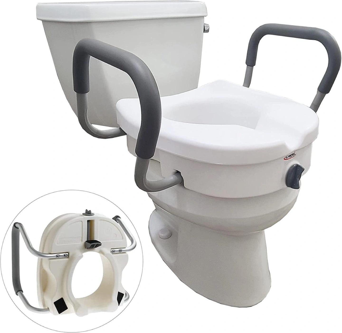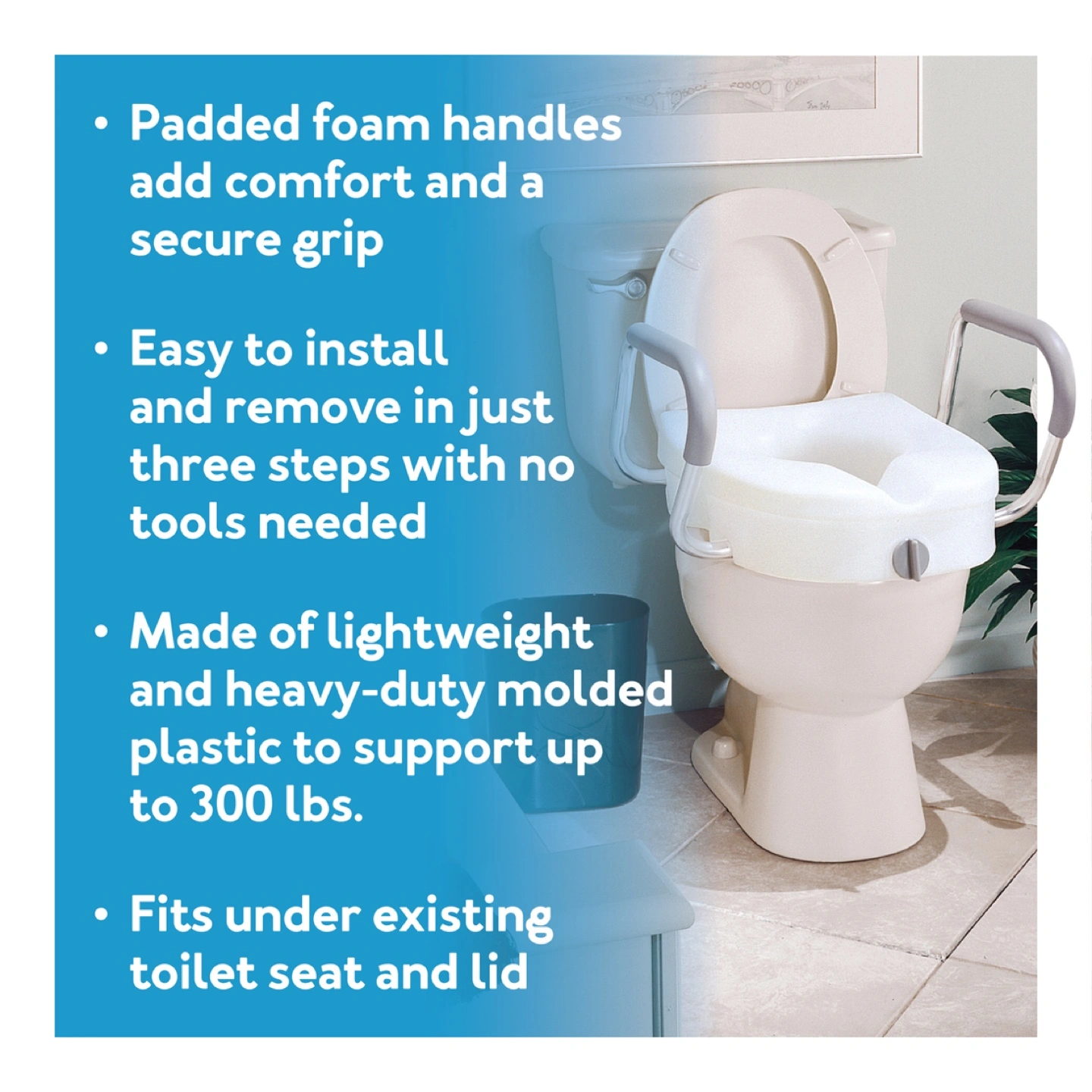 Adds 5" of height to the toilet seat. Anyone with sitting or standing difficulties can benefit significantly from a toilet seat extender. It reduces the sit to stand height and prevents slips and falls. Comes with padded armrests for comfort and support. The toilet seat with arms adds a higher level of support for those with significant medical or balance issues. This bathroom aid acts as a handicap toilet seat or a toilet seat for elderly persons. 17.25" of width between the armrests. An ample amount of width offers flexibility and natural movement for anyone in need. Safely secures to the toilet. The elevated toilet seat secures to the toilet via a locking mechanism for a tight fit. You won't have to worry about the bathroom aid coming loose. Durable, lightweight, and portable. The portable toilet seat riser is constructed of heavy-duty molded plastic for a reliable source of support. Its 300 lbs weight capacity gives it a sturdy build for continuous and long-term use. A lightweight build enables it to be transported to other bathrooms without issue easily.