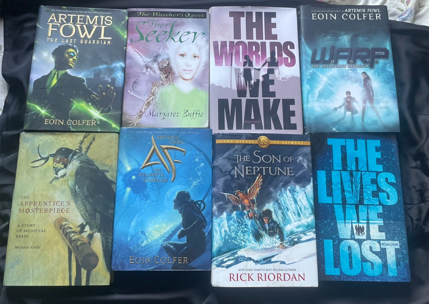 Lot of eight young adult novels. Includes titles from popular series like Artemis Fowl, The Heroes of Olympus, and others. Great for readers or collectors.