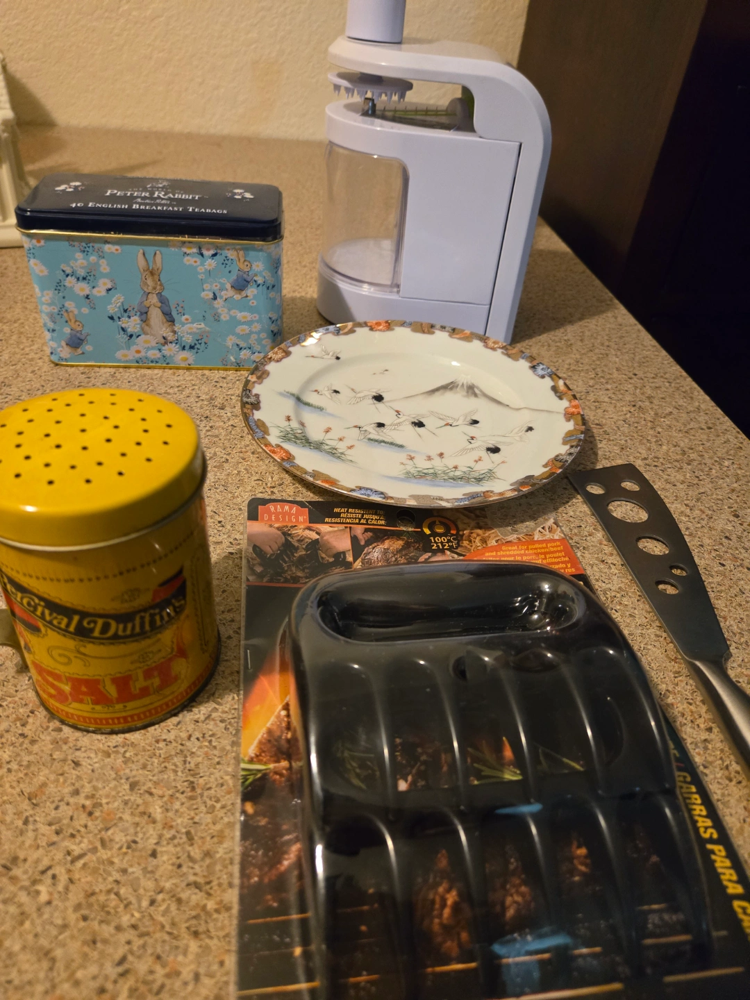 Collection of various kitchen items. Includes a Peter Rabbit tea tin, Percival Duffin's salt container, a decorative plate, a handheld vegetable slicer, and a Rama Design grill press. Also includes a cheese knife.