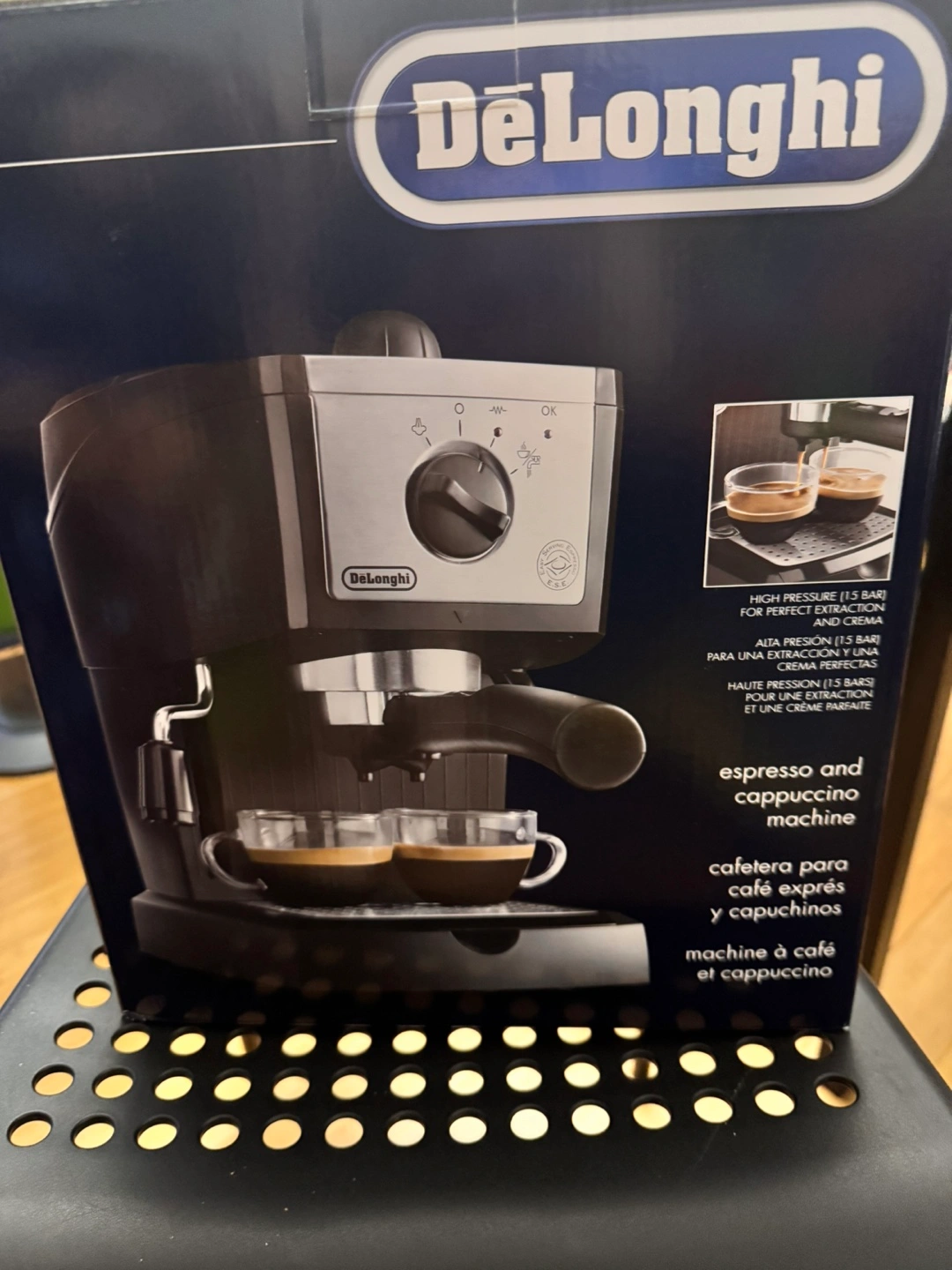 New in box DeLonghi espresso and cappuccino machine. High pressure (15 bar) for perfect crema. Features swivel frother, easy to use function selector, drip tray.