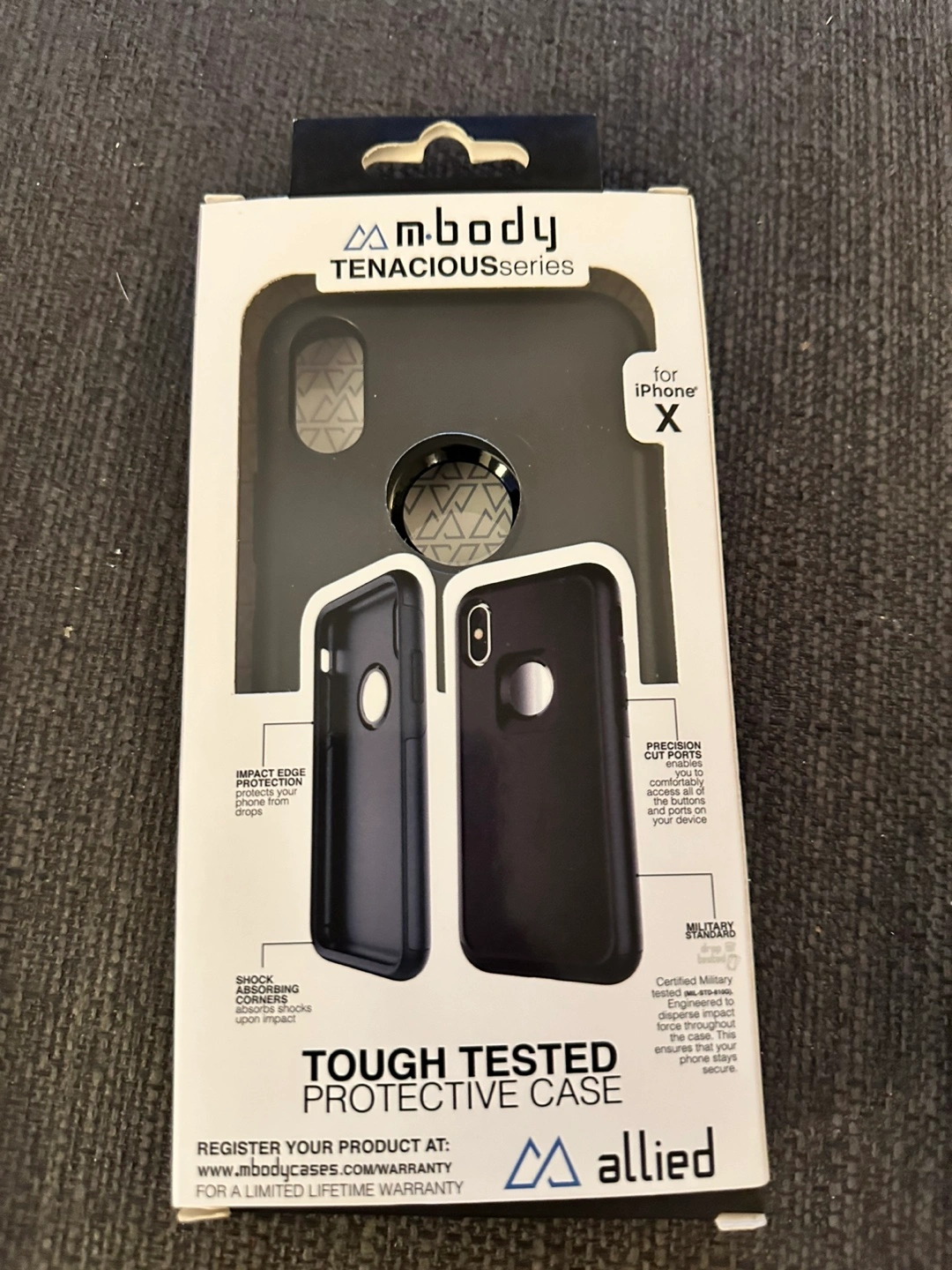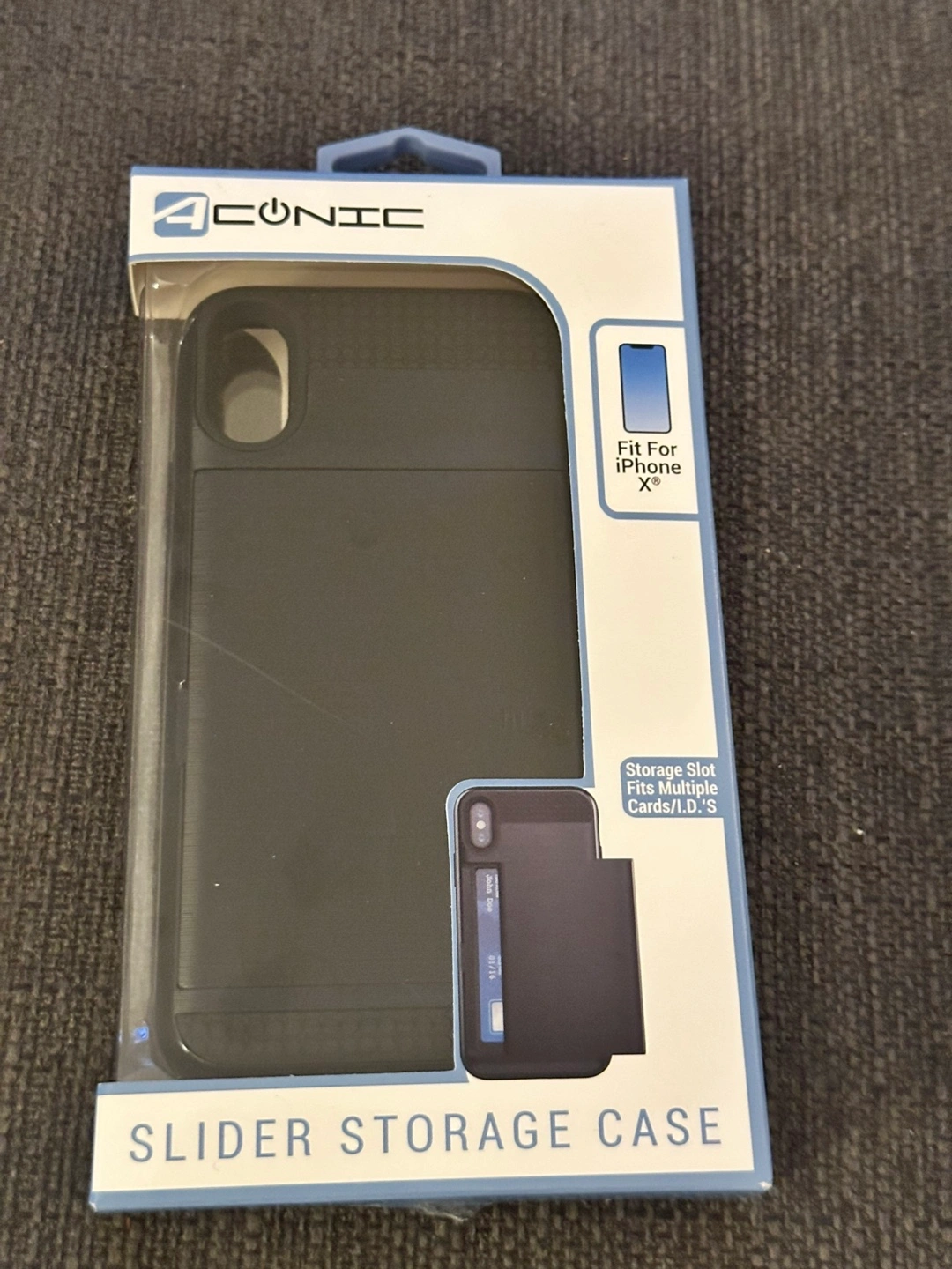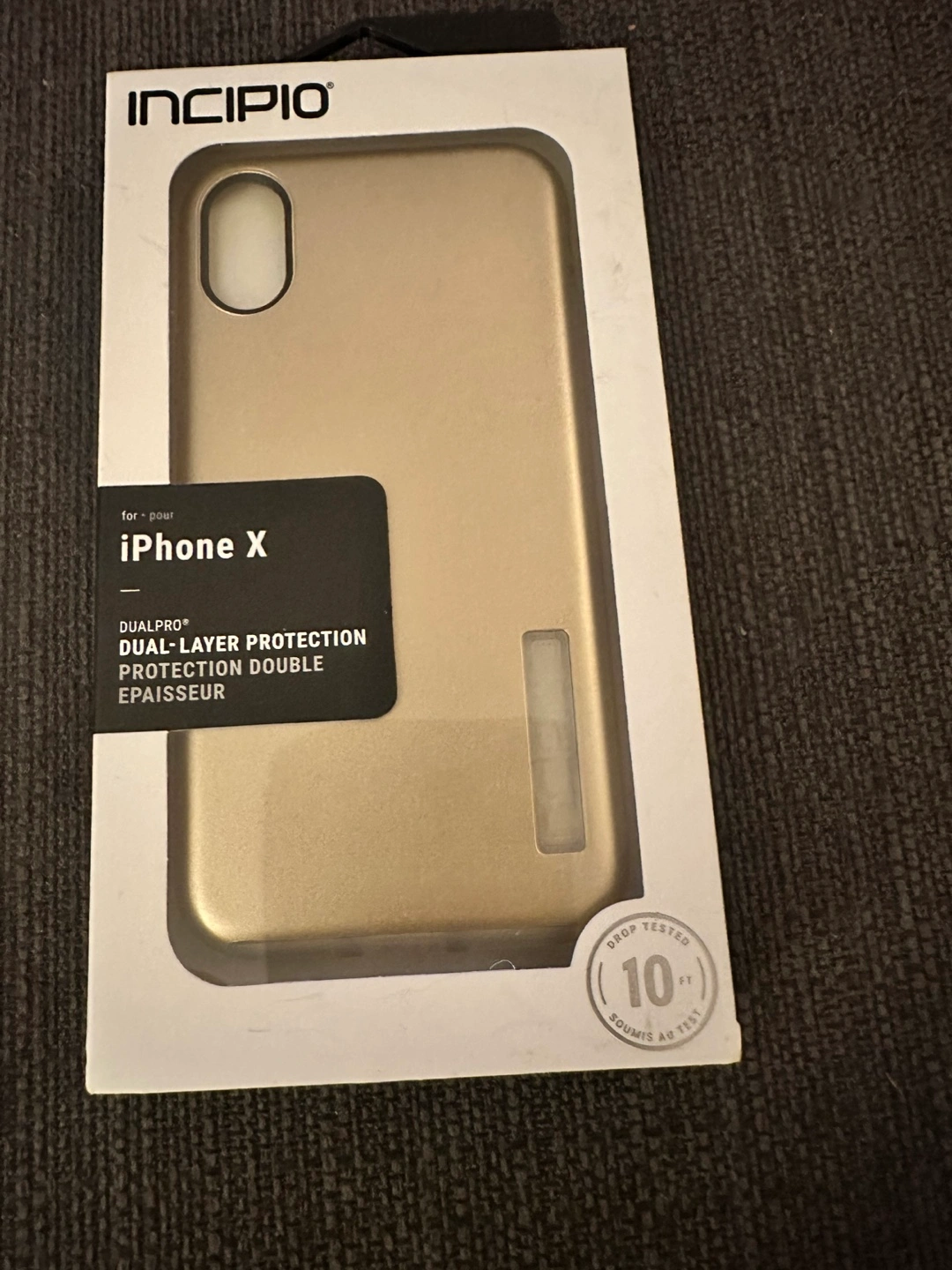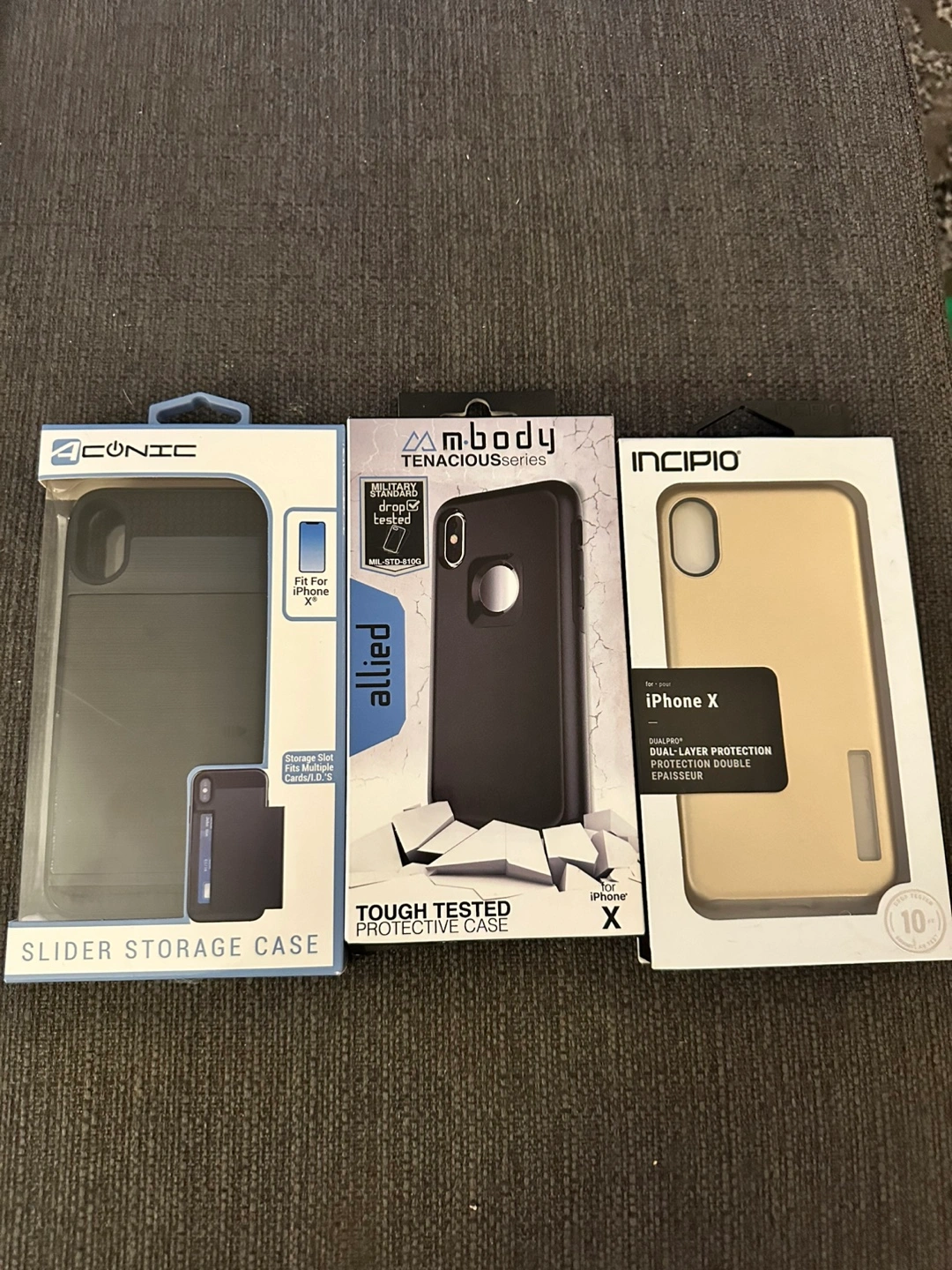 249Three iPhone X cases. One black case with storage for cards and ID. One black protective case. One gold protective case. All new in original packaging.