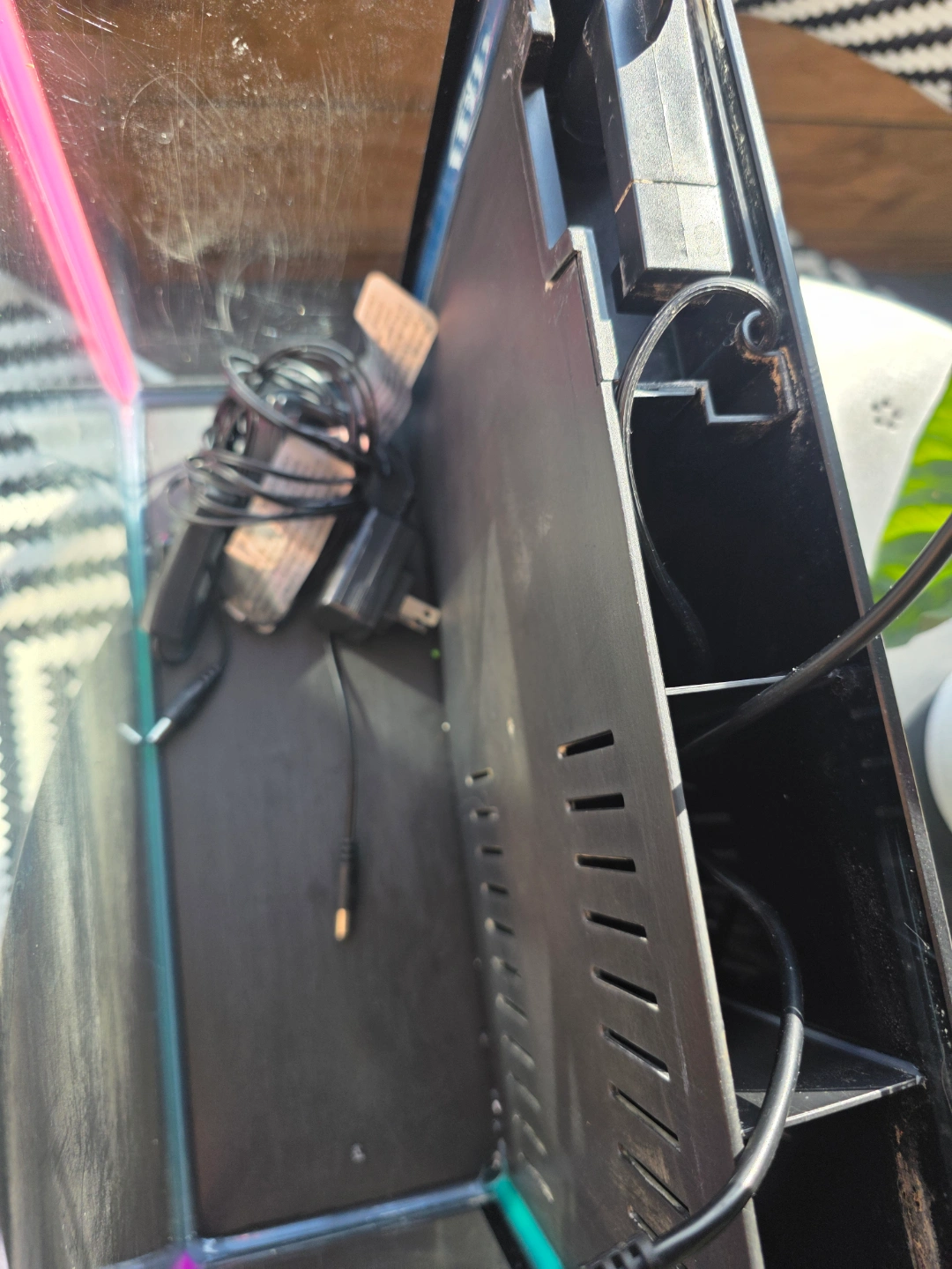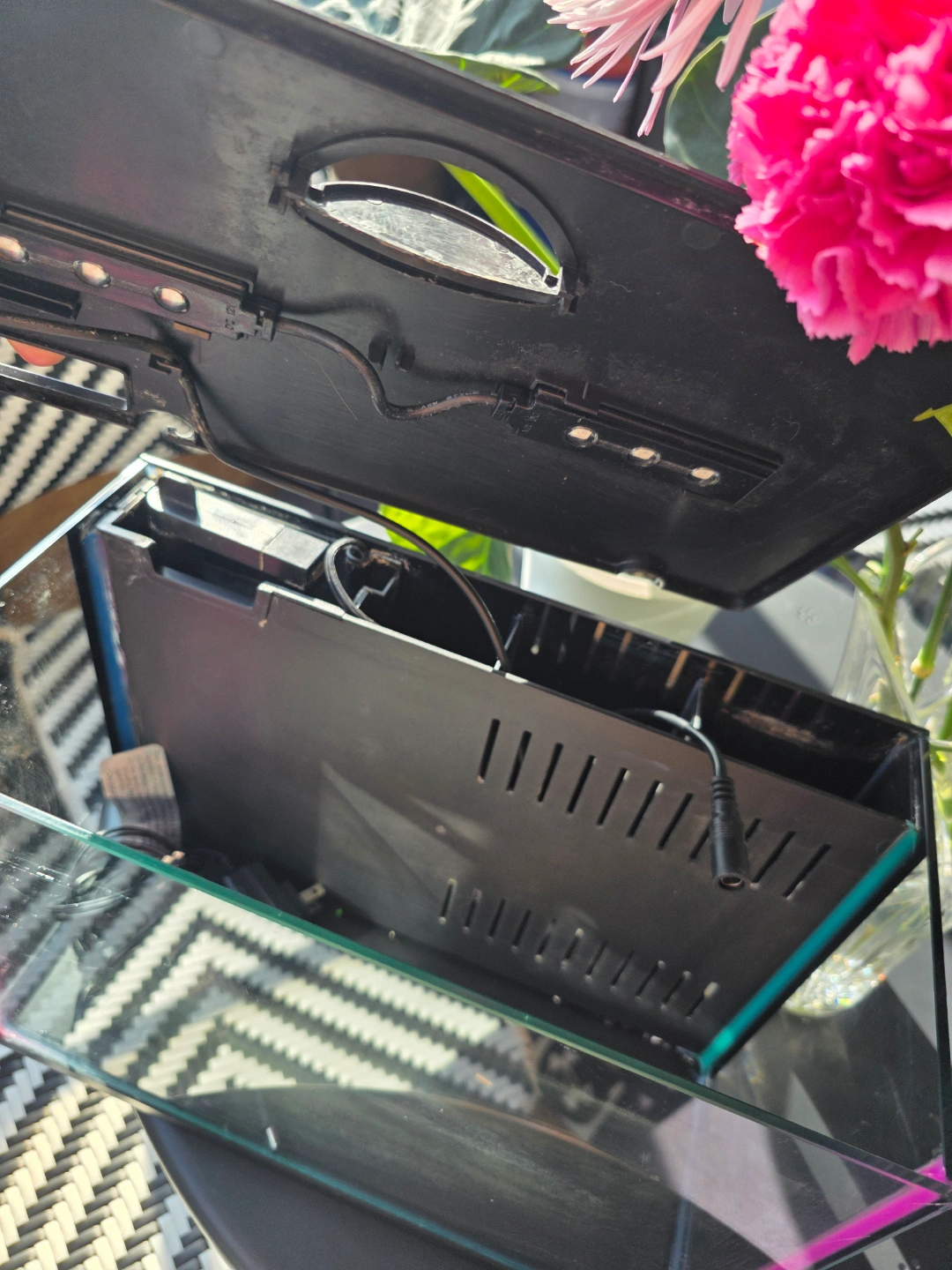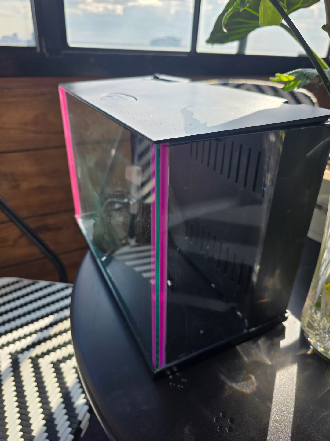 Compact aquarium with integrated LED lighting. Includes filter. Good for small fish or invertebrates. Black with pink accents.