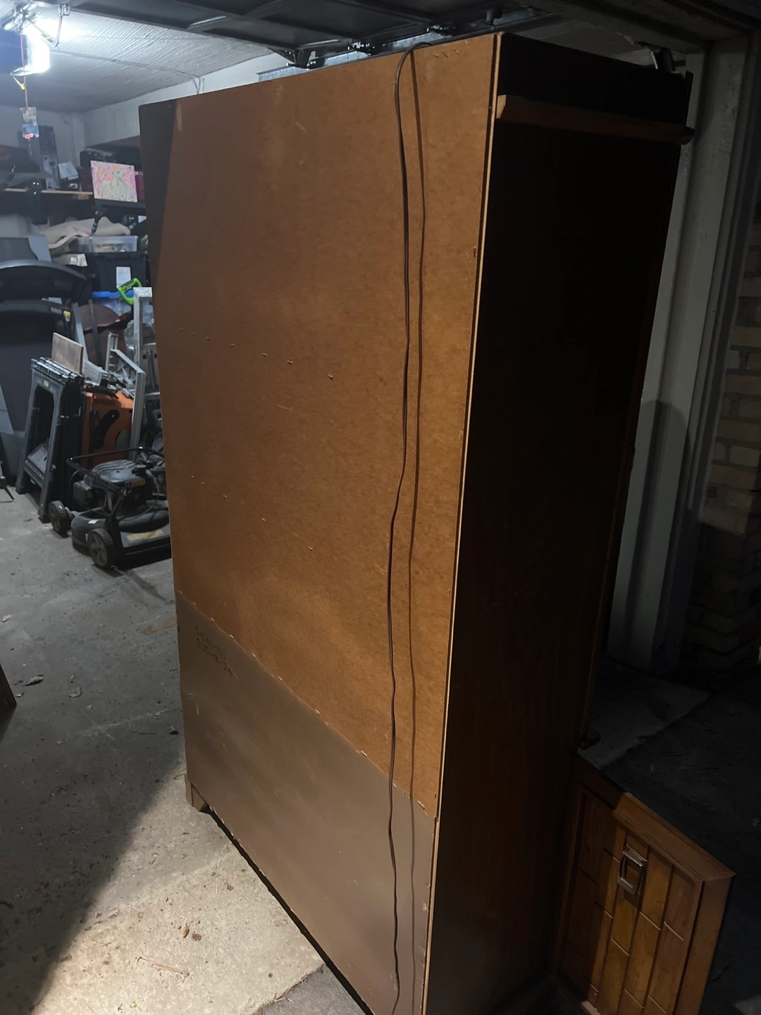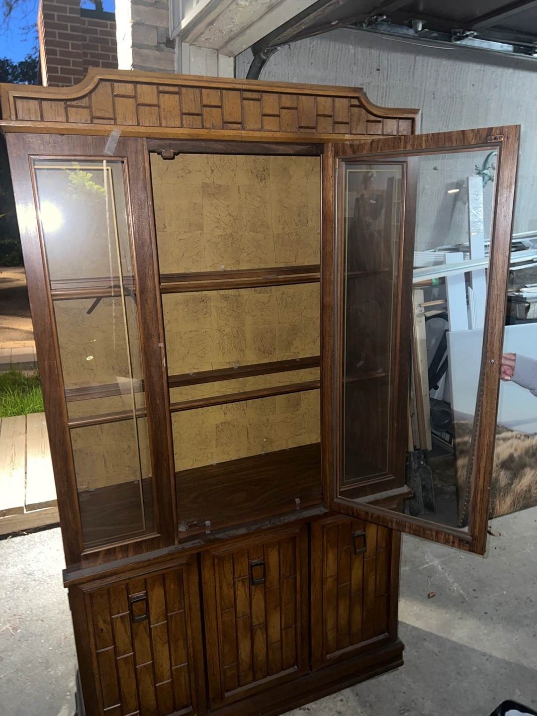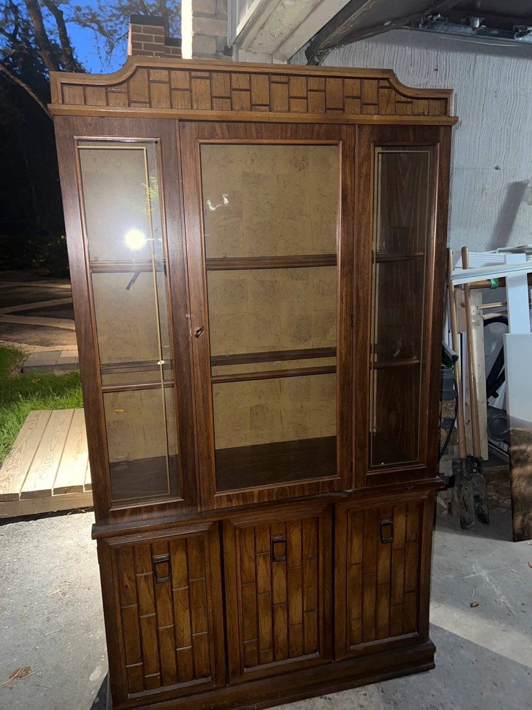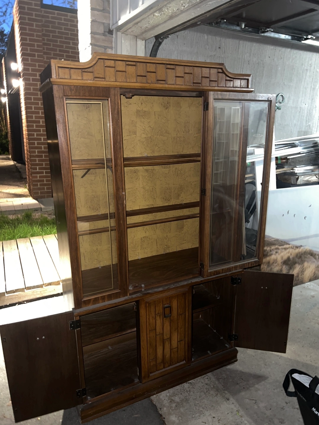 Large vintage wooden hutch with glass doors. Features multiple shelves and lower cabinets. Some wear and tear present. Solid wood construction. Great for storage or display.
