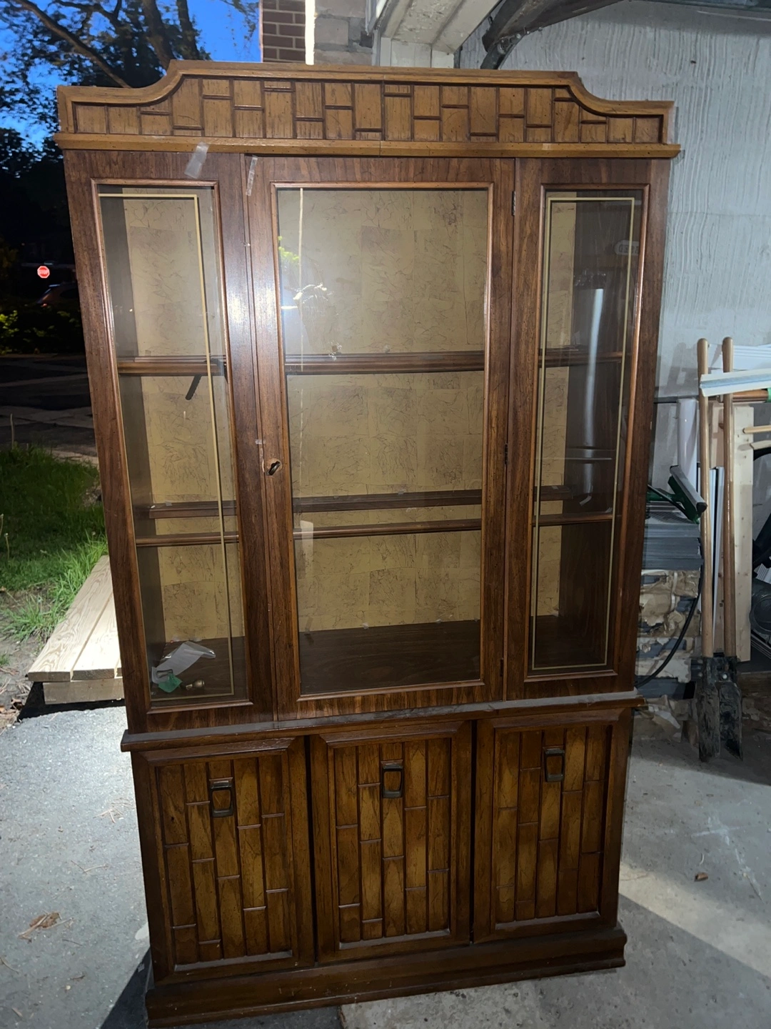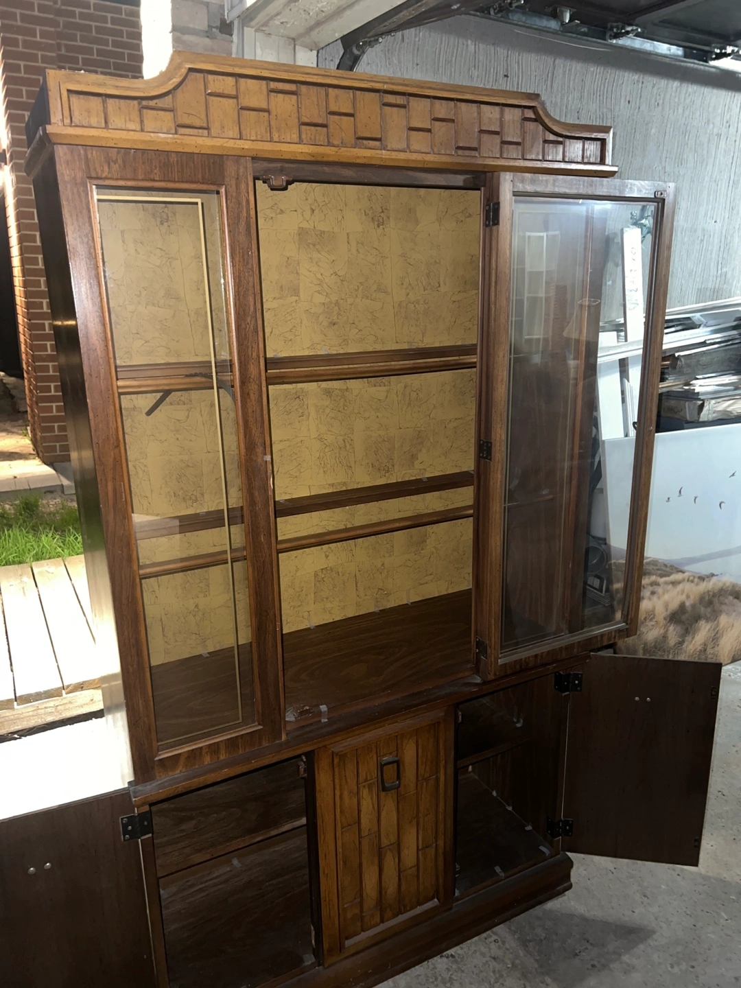 Large vintage wooden hutch with glass doors. Features multiple shelves and lower cabinets. Some wear and tear present. Solid wood construction. Great for storage or display.