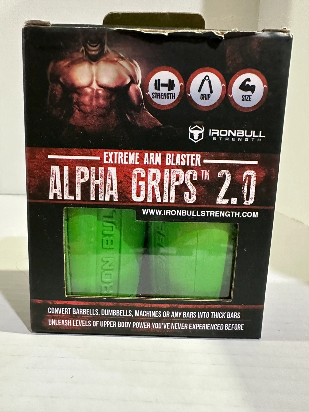 New in box. Green Alpha Grips 2.0. Extreme arm blaster. Turn any exercise into thick bar training. Increase finger, hand, forearms and arms muscle and size. Designed in Canada.