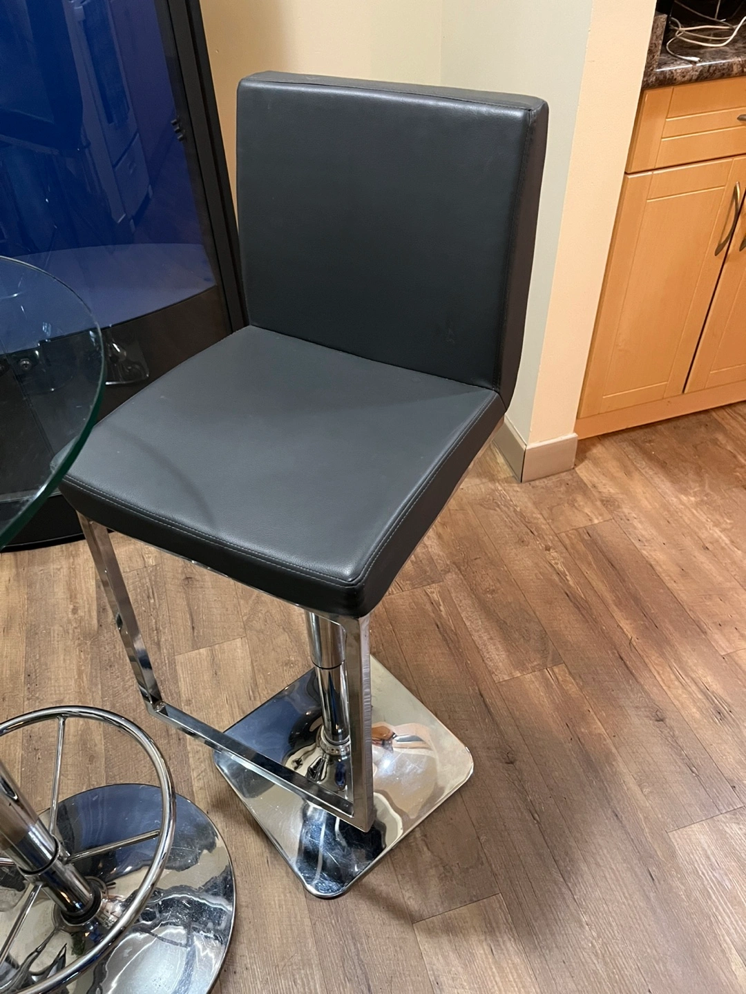 Modern pub table set. Includes a round glass tabletop and two gray cushioned bar stools.