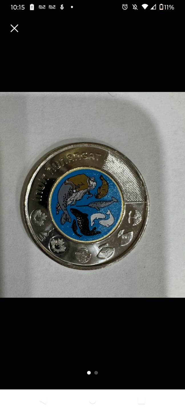 Two Canadian coins. One is a 2020 two-dollar coin featuring the Queen Elizabeth II. The other is a 2021 two-dollar coin with an aquatic theme.