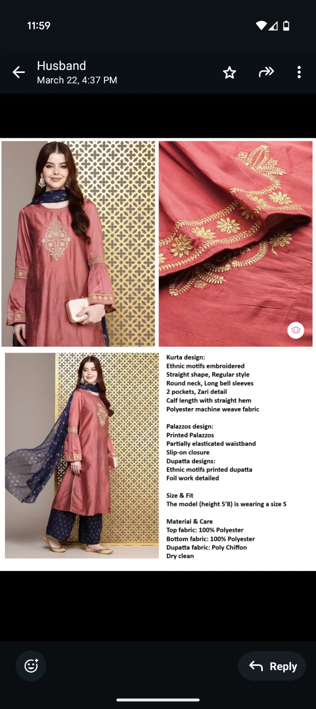 Beautiful three-piece outfit. Features embroidered kurta, printed palazzo pants, and matching dupatta. Long bell sleeves, calf-length. Polyester and chiffon fabrics. Dry clean.