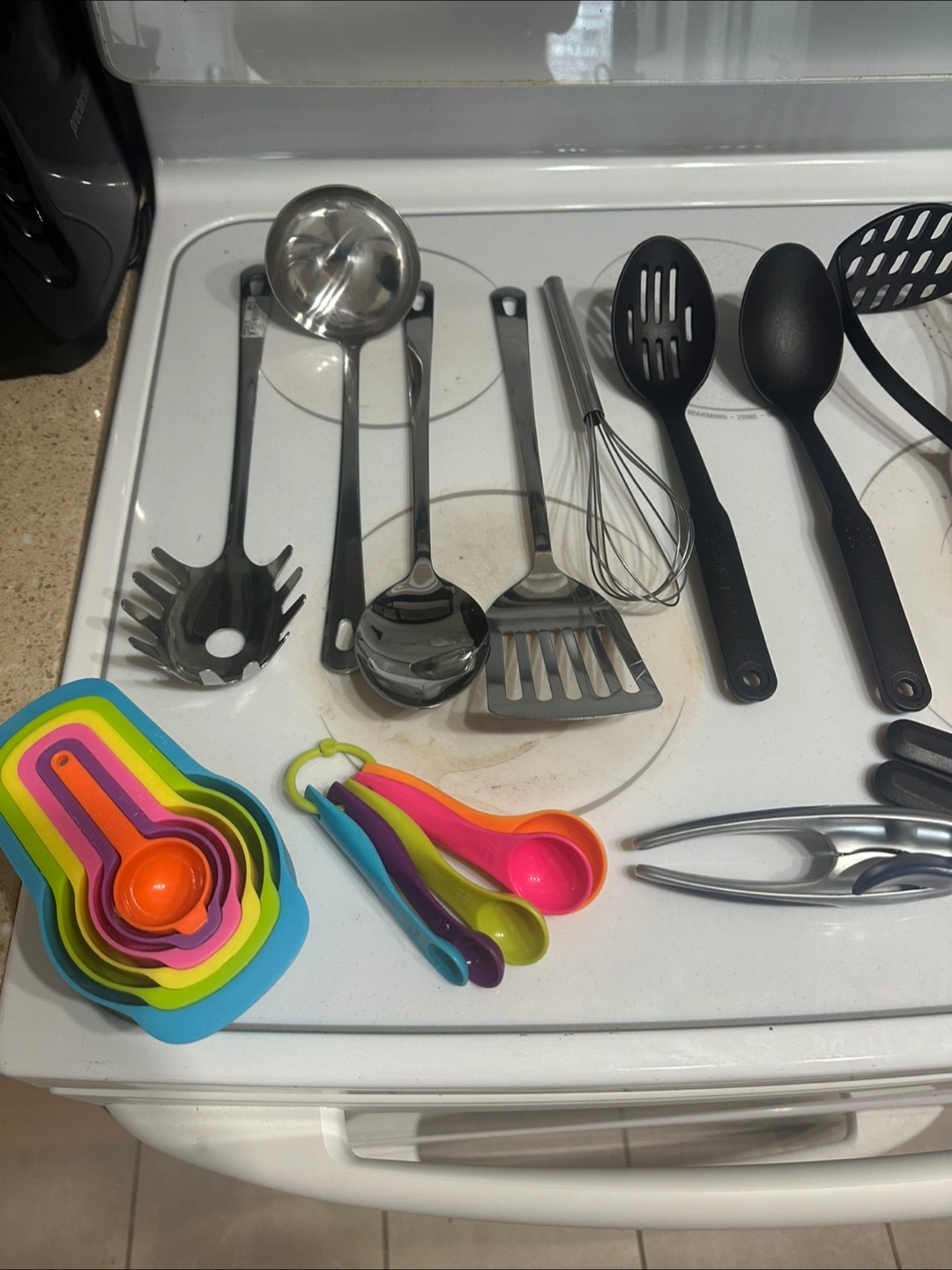 Includes various serving spoons, spatulas, whisks, a set of measuring spoons and measuring cups